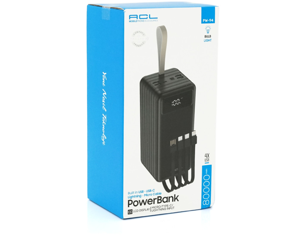 | Powerbank ACL PW-94 80000mAh, 4xUSB, 4 кабелі (USB / Micro / Type-C / Lighting), 1,4 кг, Black, Box |