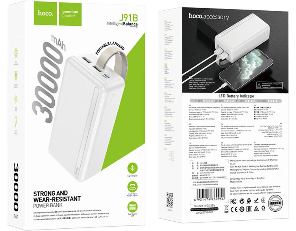 Power Bank HOCO J91B 30000mAh, USB+Type-C, 2A, White, 0.660kg, Box