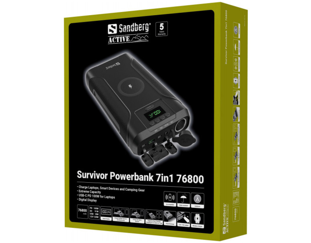 Універсальна мобільна батарея Sandberg Survivor Powerbank 7в1 76800 - це переносна зарядна станція ємністю 76800 мА год. Вона оснащена великою кількістю роз’ємів для поповнення заряду майже усіх ваших портативних гаджетів. Порти USB Type-C підтримують протокол швидкого зарядження Power Delivery. Поповнюйте заряд ноутбуків, планшетів, смартфонів, використовуючи швидкісний порт USB Type-C1, який заряджає підключені пристрої з потужністю до 100 Вт, та порт USB Type-C2 з потужністю до 30 Вт. Порт USB Type-A з протоколом Quick Charge зарядять підключені пристрої з максимальною потужністю 18 Вт. Ноутбуковий вихід DC 91 Вт з кабелем і адаптерами підійде для заряджання більшості ноутбуків. Роз’єм автомобільного прикурювача 120 Вт 12V/10A заживлять автомобільний холодильник, кавоварку та інше кемпінгове обладнання. Sandberg Survivor Powerbank 7в1 76800 також оснащена бездротовим зарядним пристроєм та допоможе поповнити заряд пристроїв, які підтримують технологію Qi з потужністю до 15 Вт. Час заряджання УМБ від блоку живлення, що входить до комплекту, становить 9 годин. Функція power-through дозволяє одночасно заряджати УМБ та підключені до нього пристрої. Sandberg Survivor Powerbank 7в1 76800 виготовлена з міцних водостійких матеріалів, її корпус відповідає рівню захисту IPX4, тому ідеально підходить для використання в польових умовах. Вбудований ліхтарик допоможе зорієнтуватись у темряві та легко підключити необхідне обладнання. |