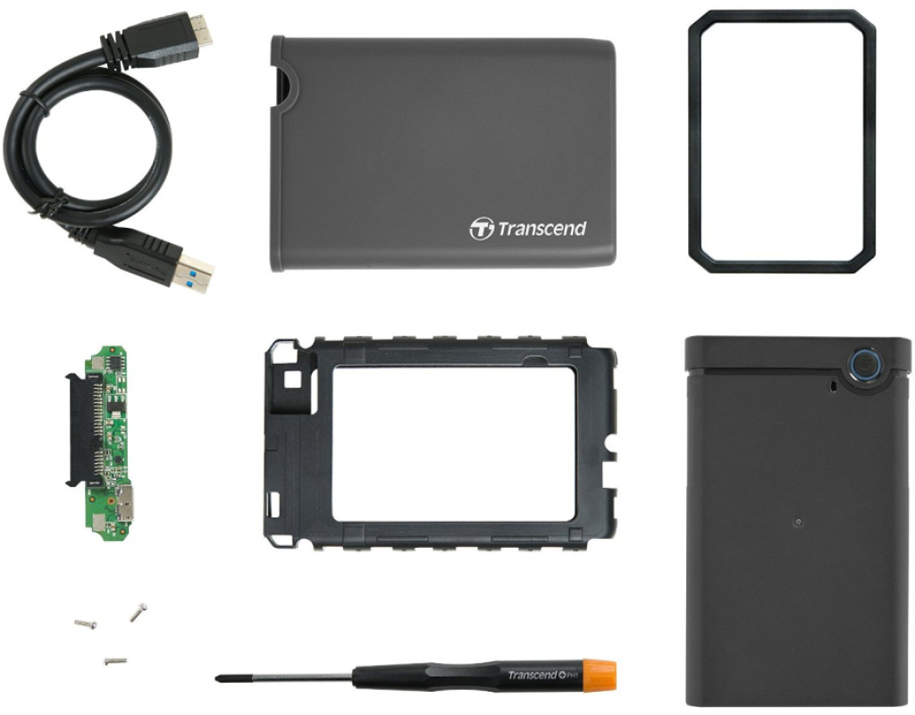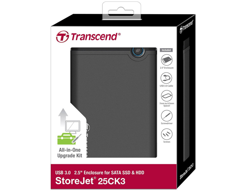 Що зазвичай відбувається з застарілими накопичувачами, які ви витягаєте з свого ноутбука? Не викидайте їх — знайдіть їм нове застосування! Комплект для встановлення накопичувачів Transcend TS0GSJ25CK3 поставляється з усіма необхідними інструментами, які дозволять повторно використовувати витягнутий з ноутбука 2,5-дюймовий жорсткий диск. Щоб зробити це, потрібно лише дотримуватися простих покрокових інструкцій. В комплект входять зовнішній прогумований корпус, внутрішній гумовий амортизатор, адаптер SATA, USB-кабель, прокладка для накопичувачів товщиною 7 мм, хрестоподібна викрутка (PH1) і три монтажні гвинти M2. Transcend підтримує резервне копіювання по натисненню однієї кнопки (при наявності встановленого пакету ПО Transcend Elite), яка дозволяє синхронізувати файли і папки в один дотик.