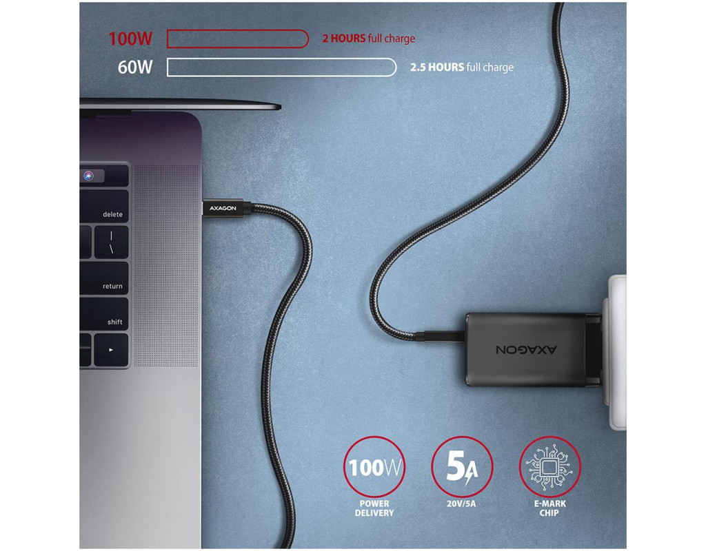 Потужне заряджання з технологією Power Delivery Кабель підтримує Power Delivery до 100 Вт (20 В / 5 А), що дає змогу заряджати не лише смартфони, а й потужні ноутбуки, монітори та портативні станції. Мідні жили високої провідності й багатошарове екранування забезпечують стабільну подачу струму без втрат енергії. AXAGON BUCM32-CM20AB гарантує безпечне заряджання без перегрівання й перешкод, навіть при тривалому навантаженні.