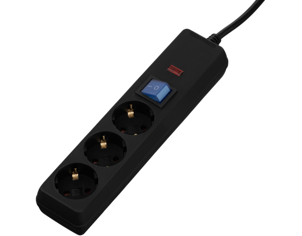 Кількість розеток - 3, євророзетка із заземленням (Тип F), Довжина кабелю - 1 м, заземлюючий контакт, із загальним вимикачем, Колір - чорний