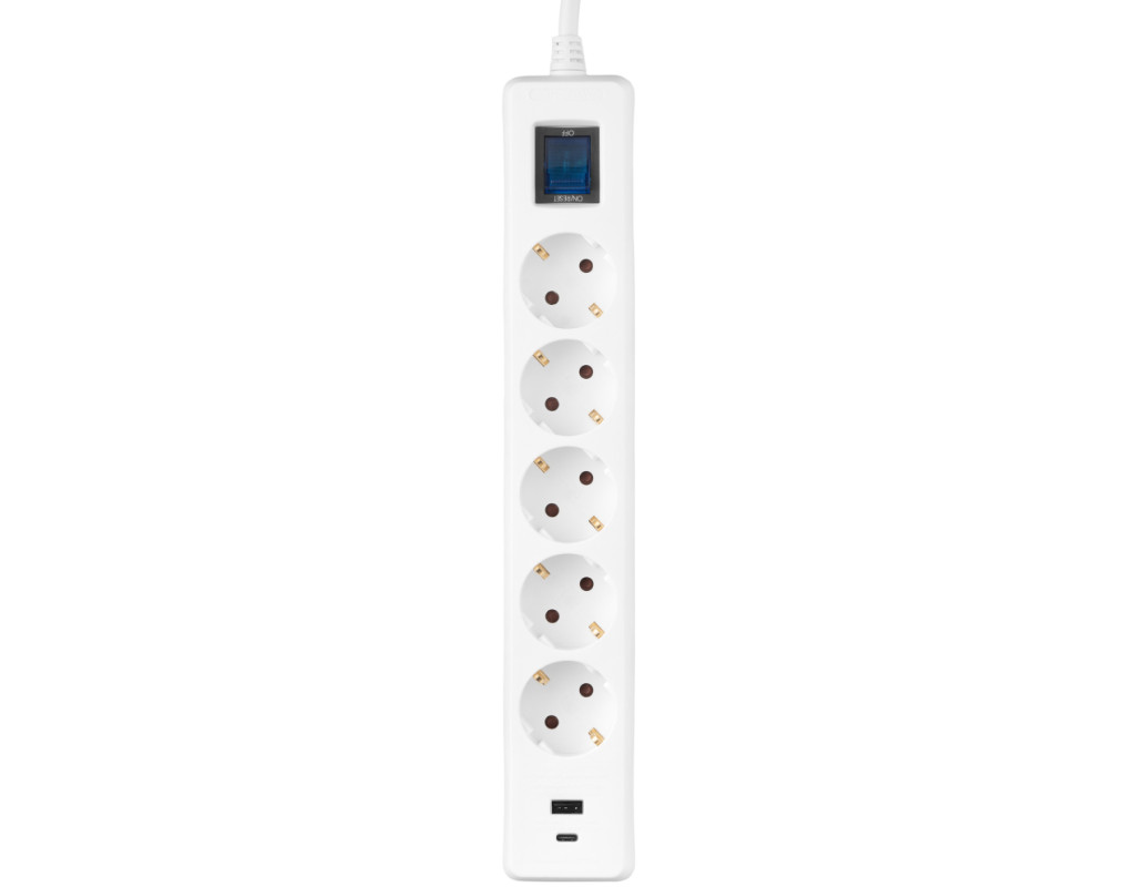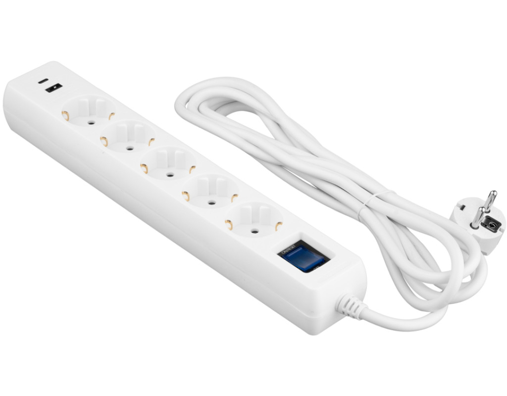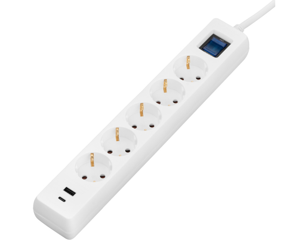Кількість розеток - 5, євророзетка із заземленням (Тип F), 1 x USB (type C), 1 x USB (type A), Довжина кабелю - 3 м, заземлюючий контакт, із загальним вимикачем, з USB, Захист - від перевантаження, Колір - білий