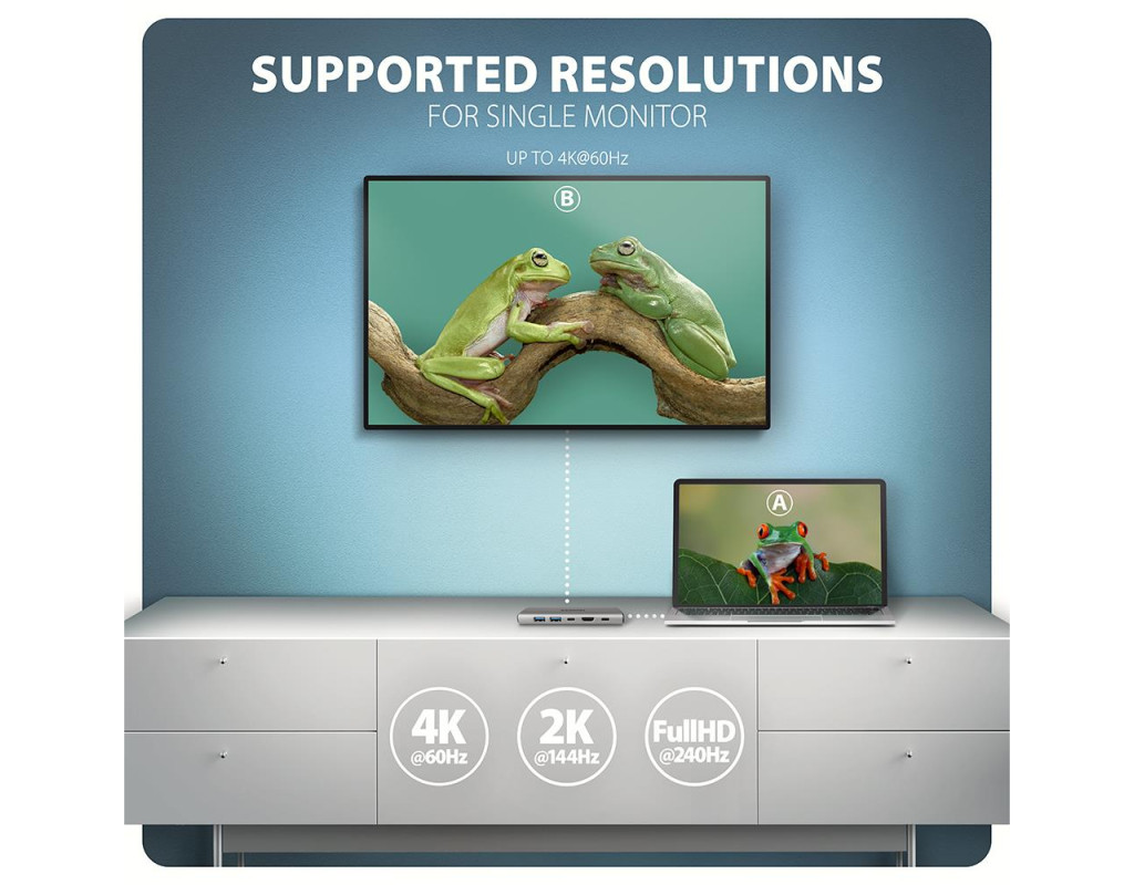 Висока якість зображення через HDMI HDMI-вихід забезпечує передачу відео з роздільною здатністю до 4K при 60 Гц, а також підтримує WQHD при 120 Гц і FullHD при 240 Гц. Технологія HDR розширює контрастність і глибину кольору, створюючи реалістичне відтворення зображення. Концентратор підтримує DisplayPort Alternate Mode, тому для виведення відео достатньо підключити пристрій через USB-C або Thunderbolt 3/4.