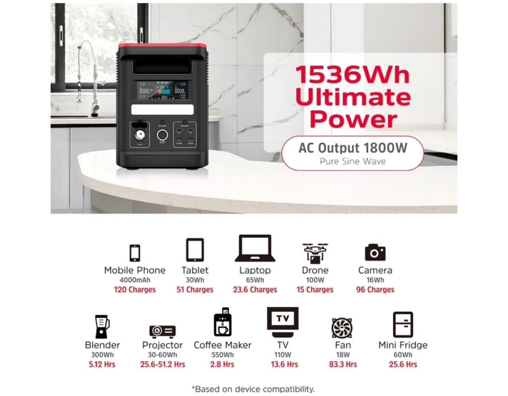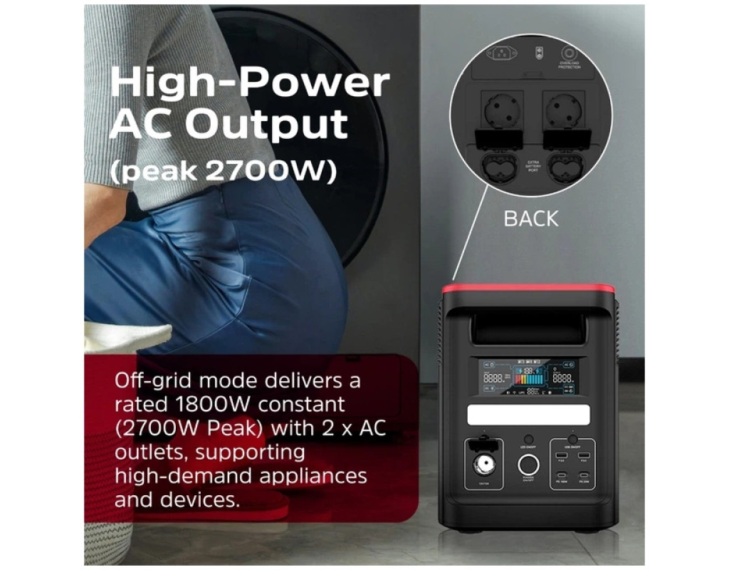 | Зарядна станція Energizer PPS1500W2F загальною вихідною потужністю 1800 Вт – це надійне резервне джерело енергії із чистою синусоїдою, яким ви можете користуватись як вдома, так і в тривалій подорожі чи кемпінгу. Стійка до високих температур LFP батарея преміум-класу ємністю 1536 Вт·год з терміном служби понад 3500 циклів. Станція Energizer PPS1500W2F оснащена двома розетками змінного струму 220-240 В 50 Гц/60 Гц, одним автомобільним портом 12 В/10 А, двома портами USB-А загальною вихідною потужністю 36 Вт, двома портами USB-C, один з яких підтримує протокол швидкого заряджання PD 100W, інший зарядить підключений пристрій з потужністю до 20 Вт. Зарядна станція сумісна з такими енергоємними приладами та пристроями, як електрична плита, мікрохвильова піч, кондиціонер і холодильник. Вона витримує загальну миттєву вихідну потужність до 2700 Вт. Energizer PPS1500W2F також може виконувати роль джерела безперебійного живлення мс - ваше домашнє електрообладнання буде надійно захищене від стрибків напруги при раптовому вимкненні електроенергії. Автоматичне перемикання в режим ДБЖ здійснюється впродовж 10 мс. Поповнити заряд електростанції Energizer PPS1500W2F можна різними способами: через розетку змінного струму з потужністю до 1500 Вт або через вхід XT60 за допомогою сонячної панелі потужністю до 1200 Вт. Заряджайте підключені пристрої під час заряджання самої станції - у режимі байпасу станція працює з максимальною вхідною потужністю 2200 Вт. Підключайте до станції додатковий акумулятор ємністю 1536 Вт·год та вдвічі збільшуйте час її автономної роботи. Вбудований світлодіодний ліхтар допоможе легко зорієнтуватись у темряві та підключити до станції усе необхідне обладнання. Energizer PPS1500W2F працює в широкому температурному діапазоні – від -10 °C до +40 °C. |