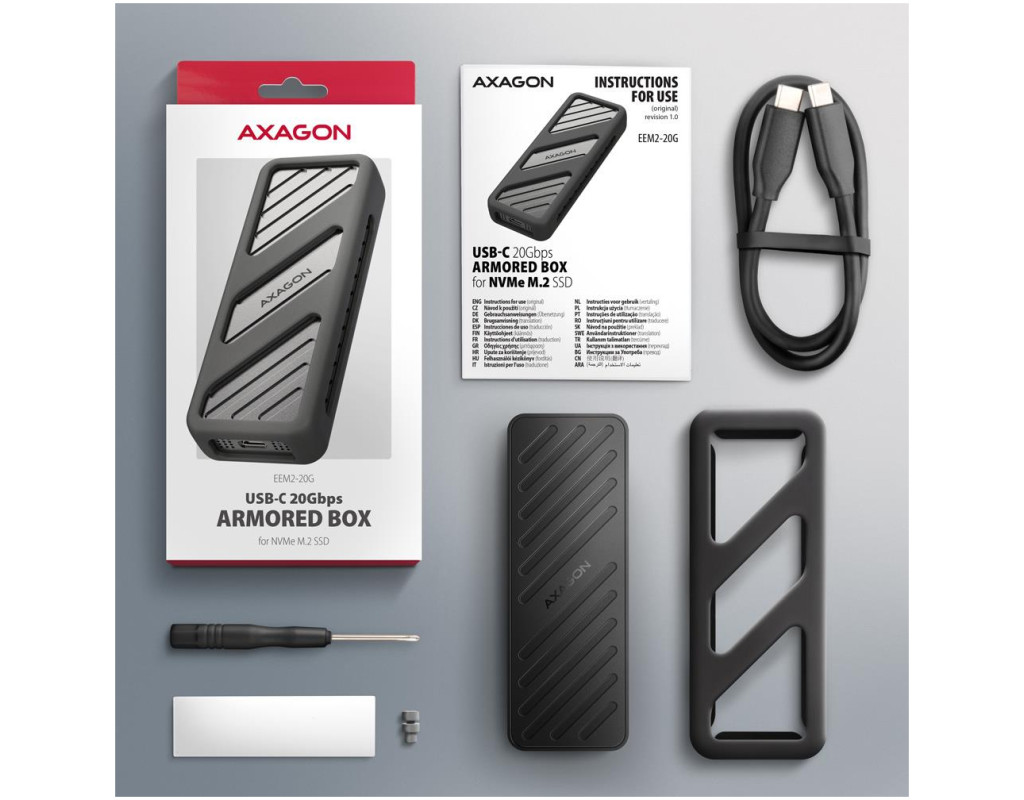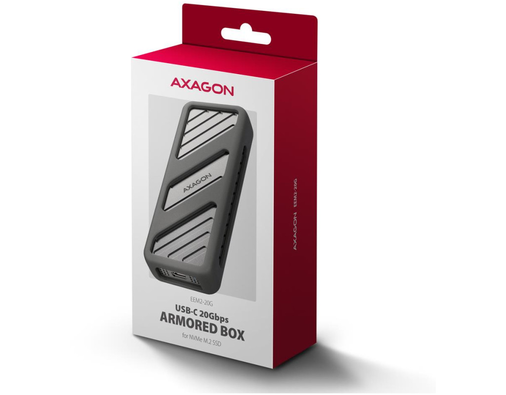Fast external AXAGON EEM2-20G ARMORED box with USB 20Gbps interface for M.2 NVMe SSDs. The double-sided USB-C connector on the box enables a reliable connection. In the package you will find a USB-C -> USB-C cable to connect the box to your computer.