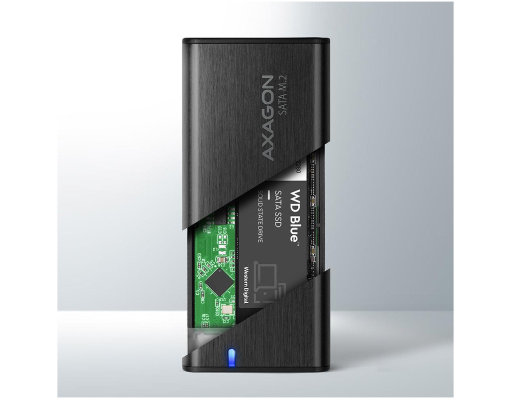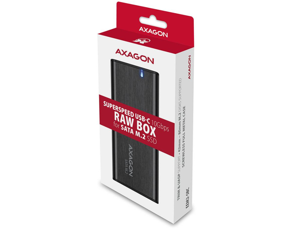 Aluminium external AXAGON EEM2-SBC RAW box with USB 3.2 Gen 2 interface is designed for SATA M.2 SSD disks. The double-sided USB-C connector on the box together with the supplied USB-C -> USB-A cable enables a reliable connection to a computer.