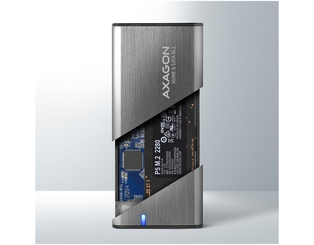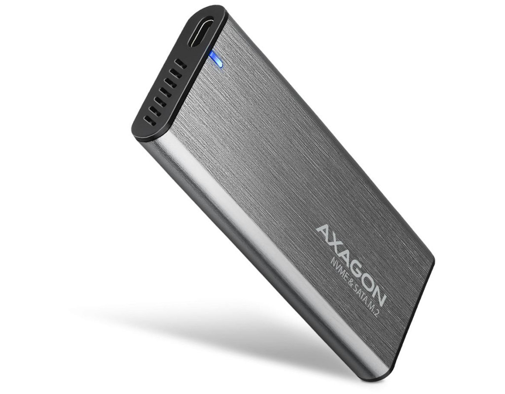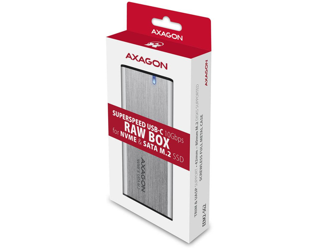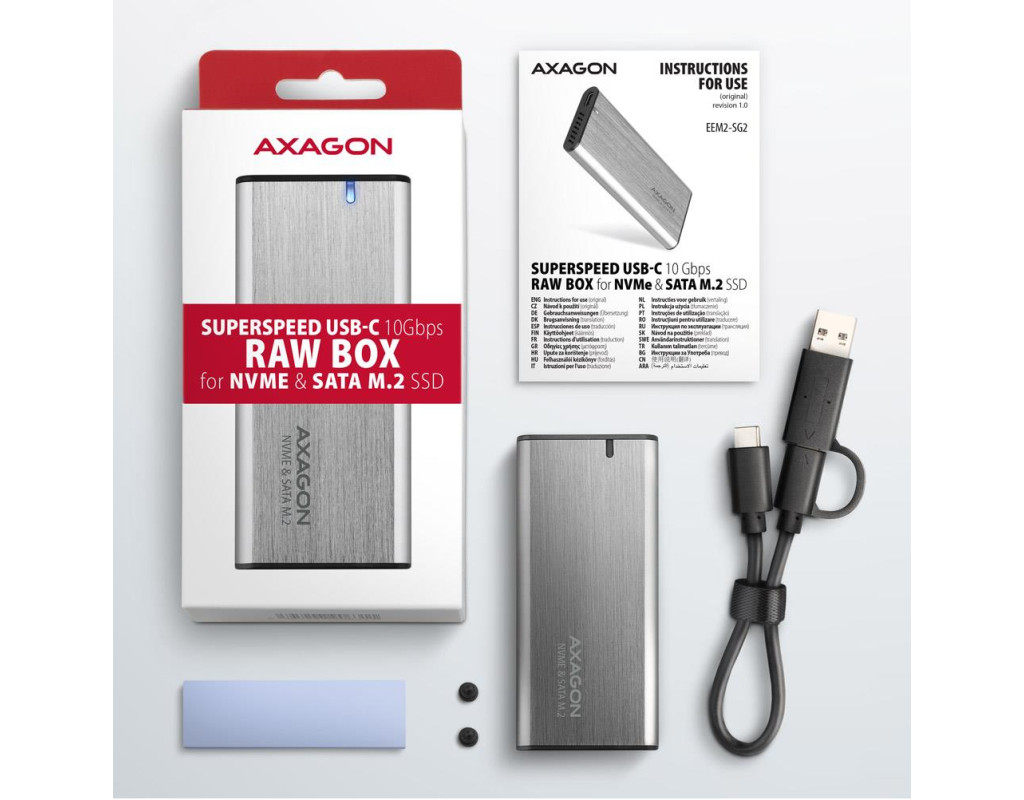 Universal external AXAGON EEM2-SG2 RAW box with USB 3.2 Gen 2 interface is designed for M.2 NVMe or SATA SSD disks. The double-sided USB-C connector on the box enables a reliable connection. The package includes not only a USB-C -> USB-C cable for connecting the box to a computer, but also a USB-C -> USB-A adapter. You can connect the box to any free USB port on the notebook.