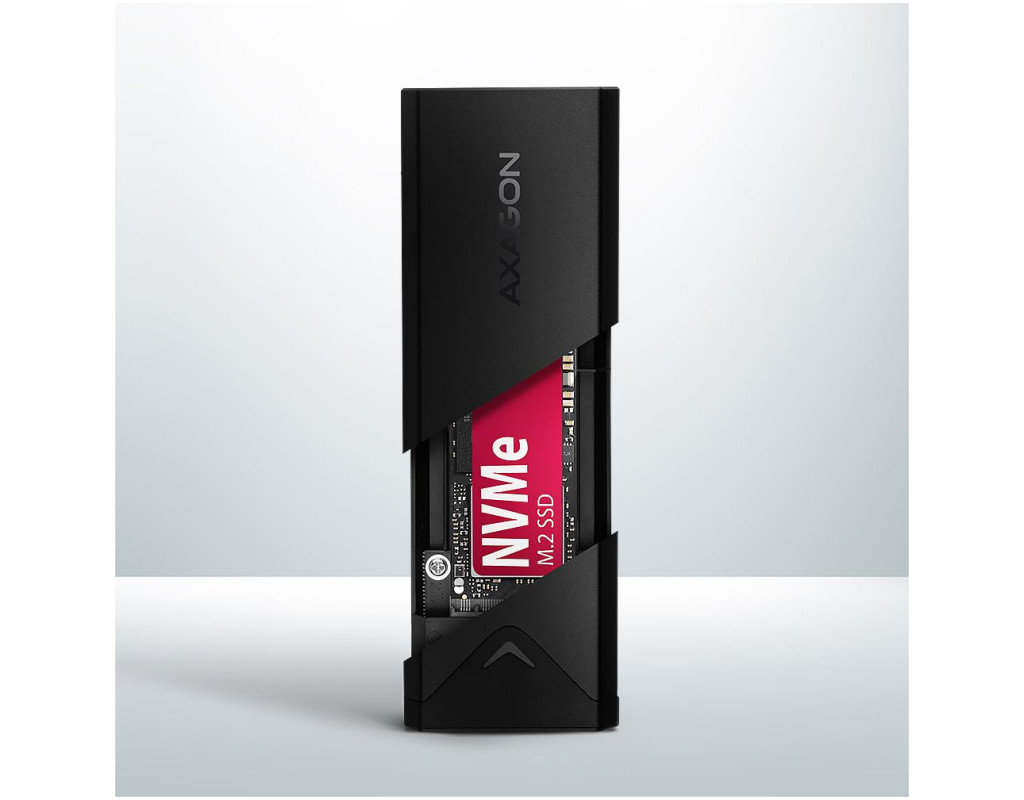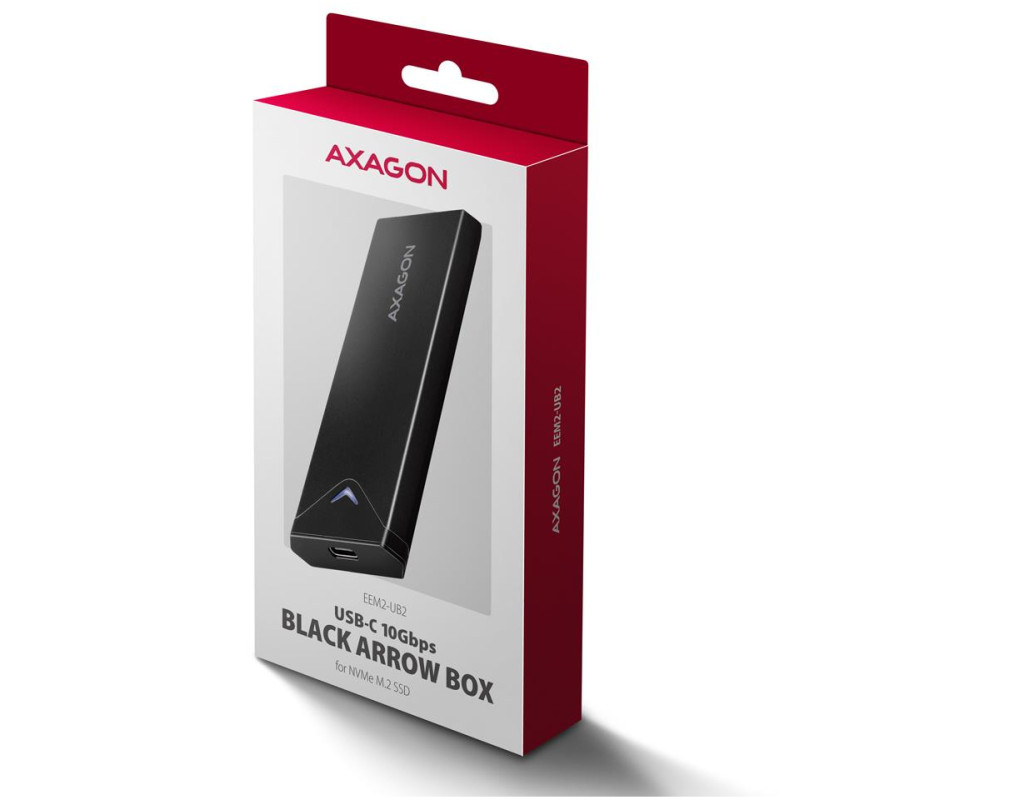 Fast external AXAGON EEM2-UB2 ARROW box with USB 10Gbps interface for M.2 NVMe SSDs. The double-sided USB-C connector on the box enables a reliable connection. In the package you will find an USB-C -> USB-C cable to connect the box to your computer.