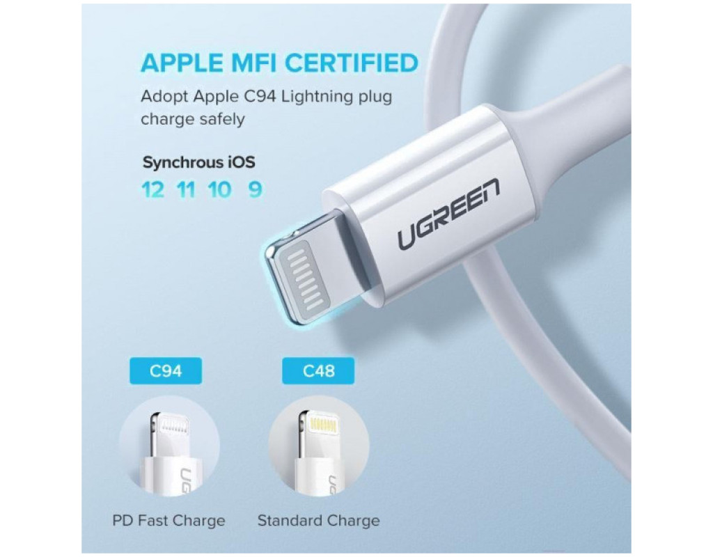 Дата кабель USB-C to Lightning 1.0m 3A US171 white Ugreen (10493) Це універсальний кабель для зарядки та передачі даних від бренду UGREEN, призначений для підключення пристроїв Apple з роз’ємом Lightning (iPhone, iPad, AirPods тощо) до джерела живлення або комп’ютера з USB‑C‑портом. Основні характеристики: Тип кабелю: USB‑C ➝ Lightning — для зарядки та синхронізації даних. Довжина: 1,0 метр — зручна довжина для використання дома, в офісі або в автомобілі. Максимальний струм зарядки: до 3 A — підтримка швидкого заряджання (через Power Delivery). Підтримка швидкості передачі даних: до 480 Мбіт/с — стандарт USB 2.0 для синхронізації файлів. Сумісність: працює з iPhone і iPad, що використовують Lightning‑роз’єм (підтримує PD‑зарядку через USB‑C адаптери). Цей кабель забезпечує стандартний рівень швидкої зарядки та стабільний обмін даними між вашим Apple‑пристроєм і джерелом живлення або комп’ютером, а також зручну довжину для повсякденного використання. |