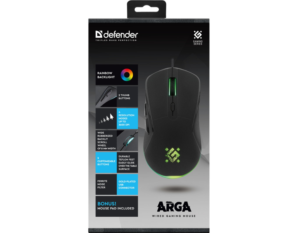 Мишка Defender Arga GM-049, 6кн. 3600 dpi, +коврик, rainbow, чорна