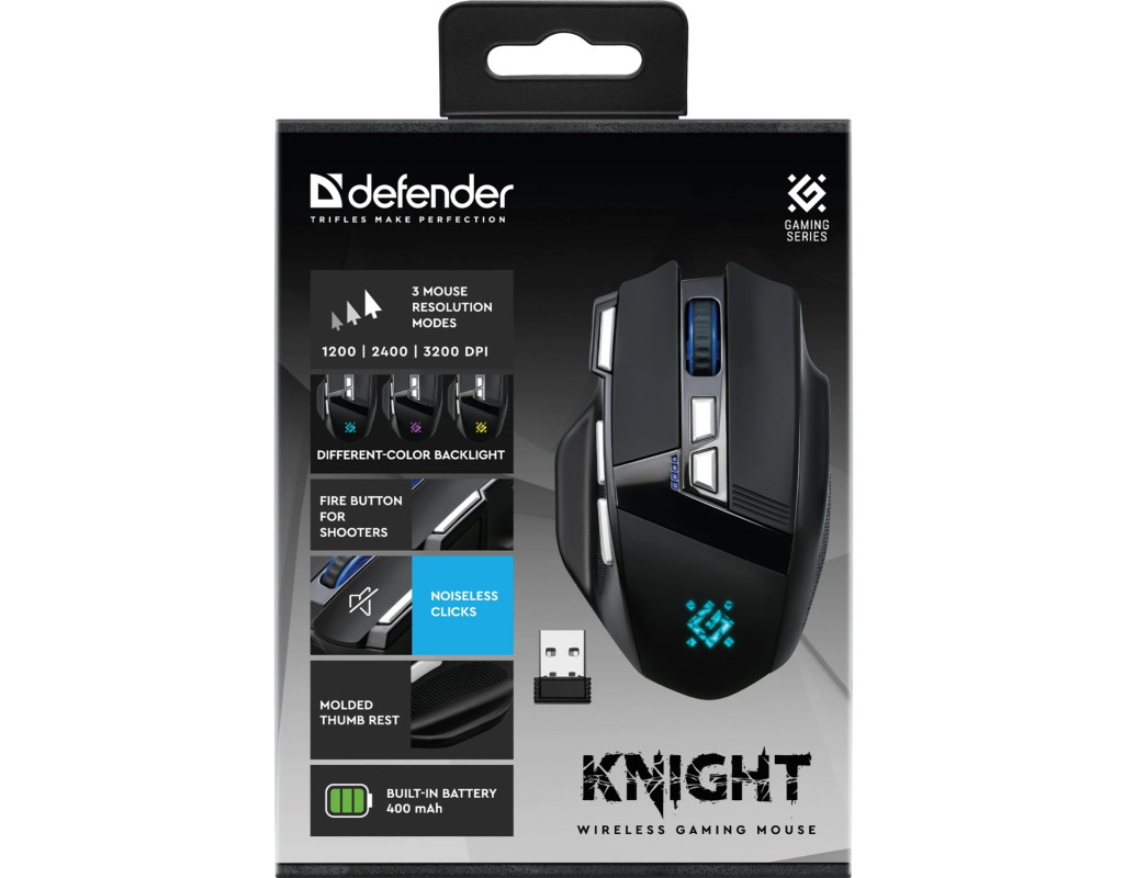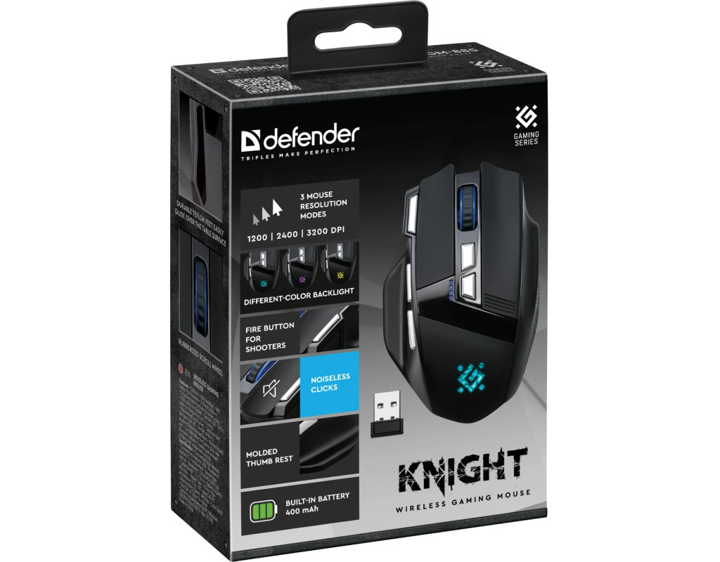 Мишка Defender Knight GM-885, бездротова, ігрова, 8кн., 3200 dpi., 400 mAh, чорна