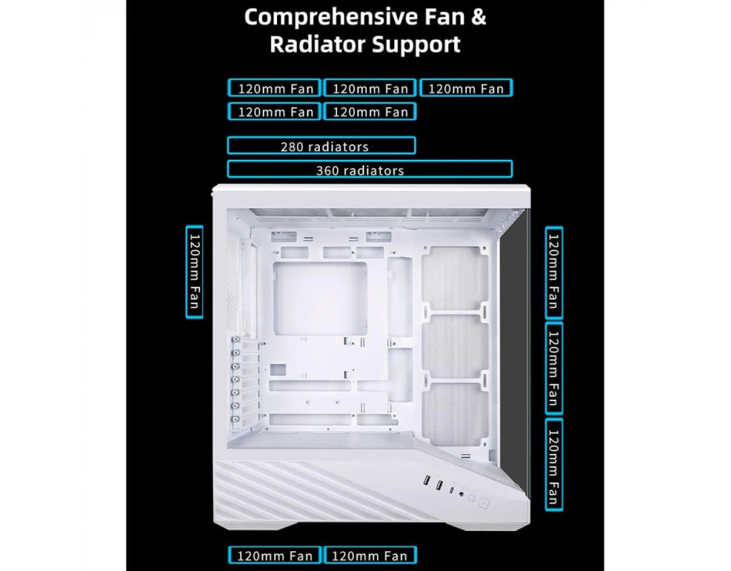 Вбудована ARGB-світлодіодна стрічка з 26 діодами, розташована вздовж кожуха блока живлення, додає яскраві налаштовувані світлові ефекти, які синхронізуються з програмним забезпеченням материнських плат. Корпус підтримує материнські плати форматів Mini-ITX, Micro-ATX, ATX і E-ATX. Оптимізована система охолодження включає підтримку встановлення додаткових вентиляторів або радіаторів до 360 мм зверху. Продумана система керування кабелями з фронтальною камерою та сітчастими панелями з перфорацією до 40,3% гарантує ефективний потік повітря. Корпус оснащений двома портами USB 3.0 Type-A, одним USB 3.1 Type-C, аудіороз’ємами та кнопками живлення. Vector V100 має слот для одного 2,5-дюймового SSD і одного 3,5-дюймового HDD, а також унікальну платформу для демонстрації колекційних предметів чи апаратного забезпечення. |