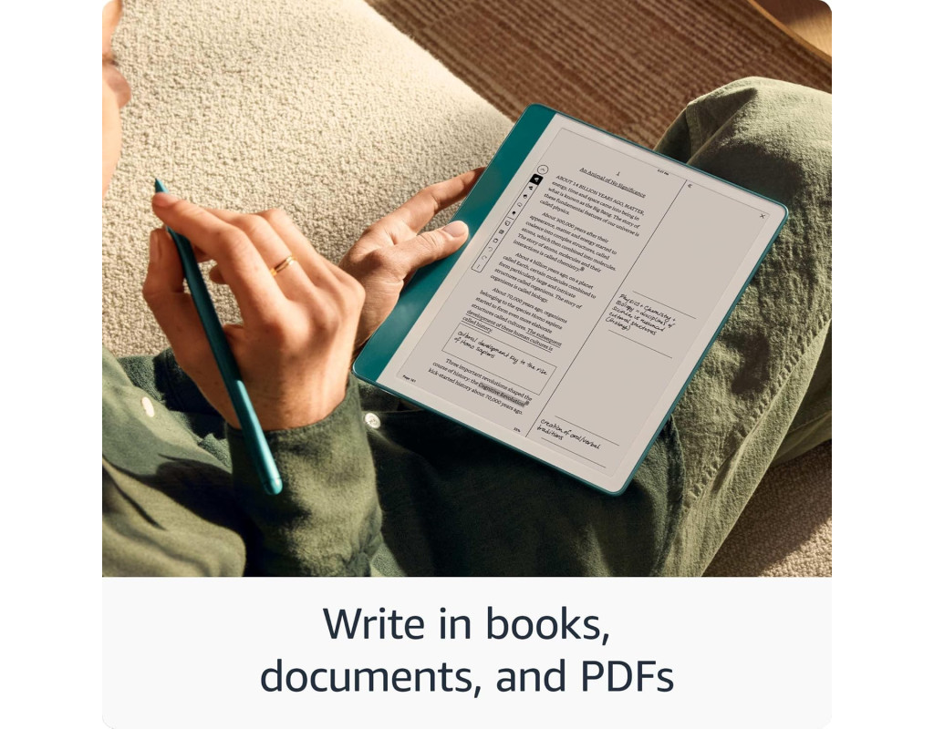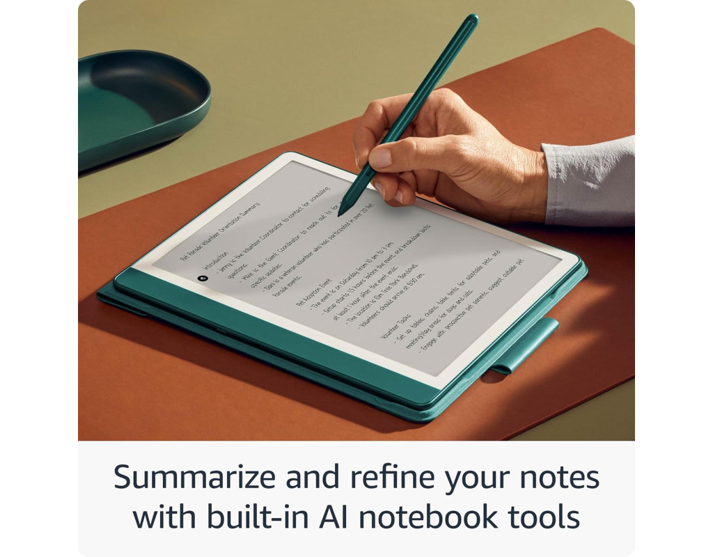 Amazon Kindle Scribe привносить у світ електронних книг та нотаток свіжий погляд на зручність та функціональність. Елегантний та стильний дизайн пристрою поєднує в собі мінімалізм та технологічні інновації, що робить його не лише ефективним інструментом для роботи, а й привабливим аксесуаром для тих, хто цінує естетику. Екран Kindle Scribe забезпечує відмінну читаність, а завдяки тонким рамкам та легкості пристрою, його зручно носити з собою у будь-якому місці, від офісу до подорожей. Новий підхід до дизайну робить Kindle Scribe ідеальним вибором для людей, які шукають не лише функціональність, а й стиль. Активне полотно Kindle Scribe перетворює ваш екран на справжнє активне полотно, яке реагує на кожен штрих. Використання електронної ручки дозволяє писати та малювати з максимальною точністю, створюючи записи, які легко редагувати та зберігати. Це ідеальний інструмент як для створення нотаток, так і для створення ескізів та ілюстрацій. Екран пристрою чутливий до натискання, що дозволяє імітувати відчуття листа на папері. А завдяки великому розміру екрану ви отримуєте більше простору для роботи і творчості. Отримуйте більше користі зі своїх нотаток Amazon Kindle Scribe допомагає не тільки створювати нотатки, але й отримувати з них максимум користі. Вбудовані інструменти для організації та пошуку нотаток забезпечують зручний доступ до потрібної інформації у будь-який час. Можливість додавати анотації, виділяти ключові моменти та швидко шукати інформацію робить цей планшет незамінним для студентів, професіоналів та всіх, хто цінує продуктивність та зручність. За допомогою Kindle Scribe ви зможете не просто записувати ідеї, а й систематизувати їх, що покращить вашу ефективність та прискорить роботу. Інструменти AI Notebook Однією з унікальних особливостей Kindle Scribe є інтеграція з AI-інструментами для нотаток, які допоможуть вам розумніше працювати. Технології штучного інтелекту здатні аналізувати ваші записи, пропонувати покращення і навіть автоматично сортувати нотатки за категоріями. Такі функції значно прискорюють процес створення та організації інформації, заощаджуючи ваш час та зусилля. Kindle Scribe не просто допомагає записувати думки, але й бере активну участь у їх систематизації, забезпечуючи високий рівень продуктивності. Переосмислена ручка Premium Pen Ручка Premium Pen для Kindle Scribe – це не просто інструмент для запису, а просунута технологія, яка створює відчуття, схожі на використання справжньої ручки та паперу. Її ергономічний дизайн та чутливість до натиску дозволяють створювати тексти та малюнки з максимальною точністю. Кожен рух стає плавним, а природний відгук робить процес листа приємним та комфортним. Ручка Premium Pen продумана таким чином, щоб унеможливити втому при тривалому використанні, що особливо важливо для тих, хто часто записує або малює. |