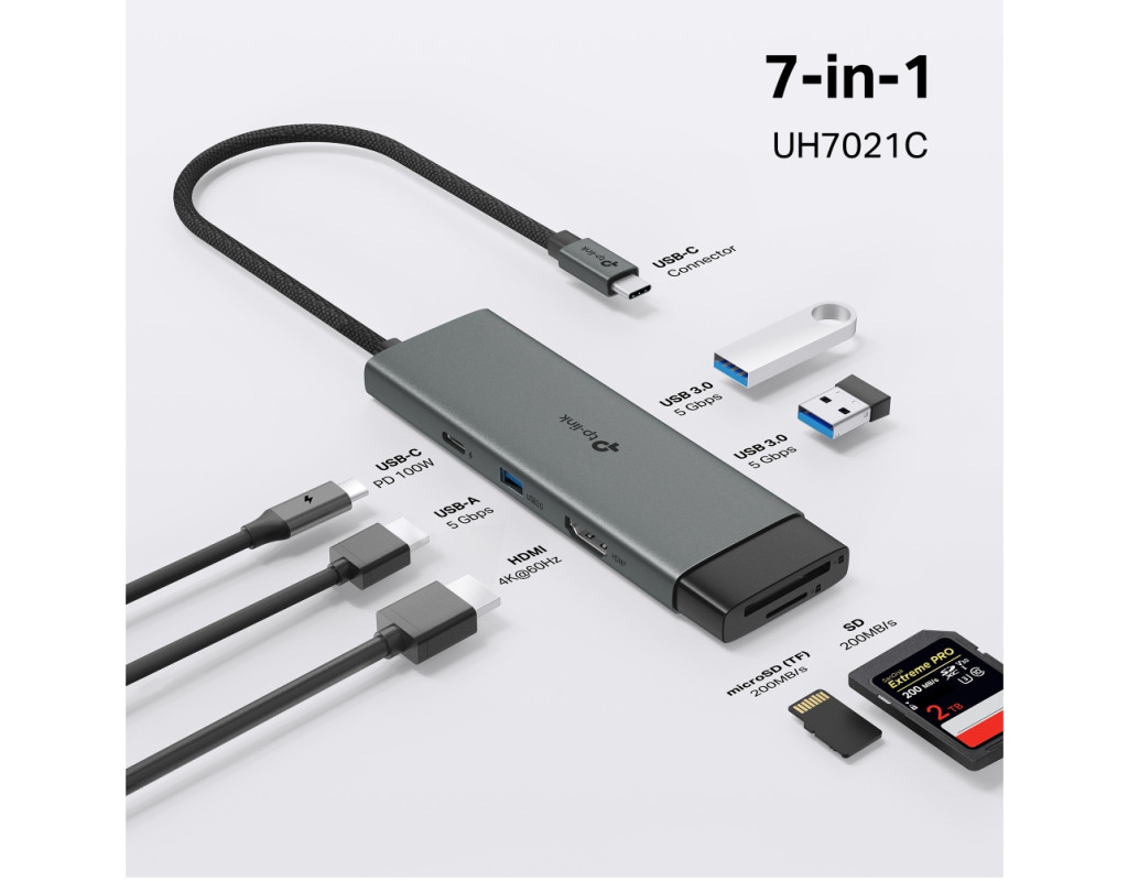Концентратор TP-Link USB-C 7-in-1 3xUSB + HDMI + SD/TF + USB-C PD100W (UH7021C)