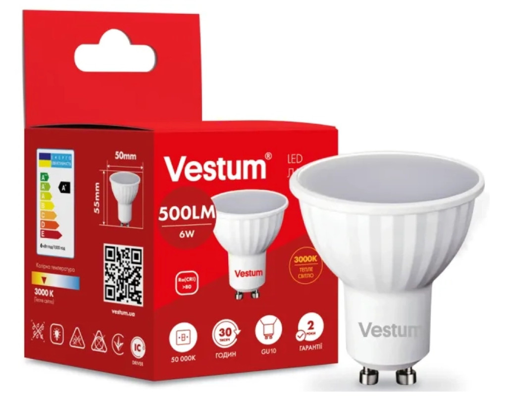 Лампочка Vestum MR16 6W 3000K 220V GU10 (1-VS-1505)