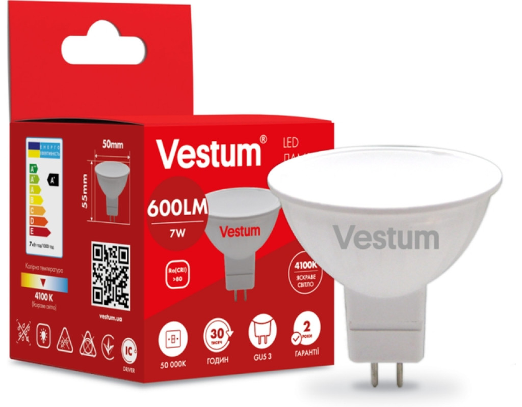 Світлодіодна лампа Vestum 1-VS-1510 потужністю 7 Вт дає 600 Лм. Споживаючи в рази менше електрики, ніж лампи розжарювання або люмінесцентні лампи, вона дає таку ж кількість світла і прослужить в кілька разів довше. Лампа має нейтральне світло, що робить її підходящою для кабінету, кухні, коридору або ванної. Цоколь GU5.3 підходить для точкових світильників. IC-драйвер забезпечує стабільну роботу лампи в широкому діапазоні напруги, 175-265 В, і запобігає пульсації. Лампа несумісна з диммером і вимикачем з підсвічуванням. У лампі використовуються світлодіоди Epistar, що забезпечують високу енергоефективність і тривалу, безперебійну роботу.