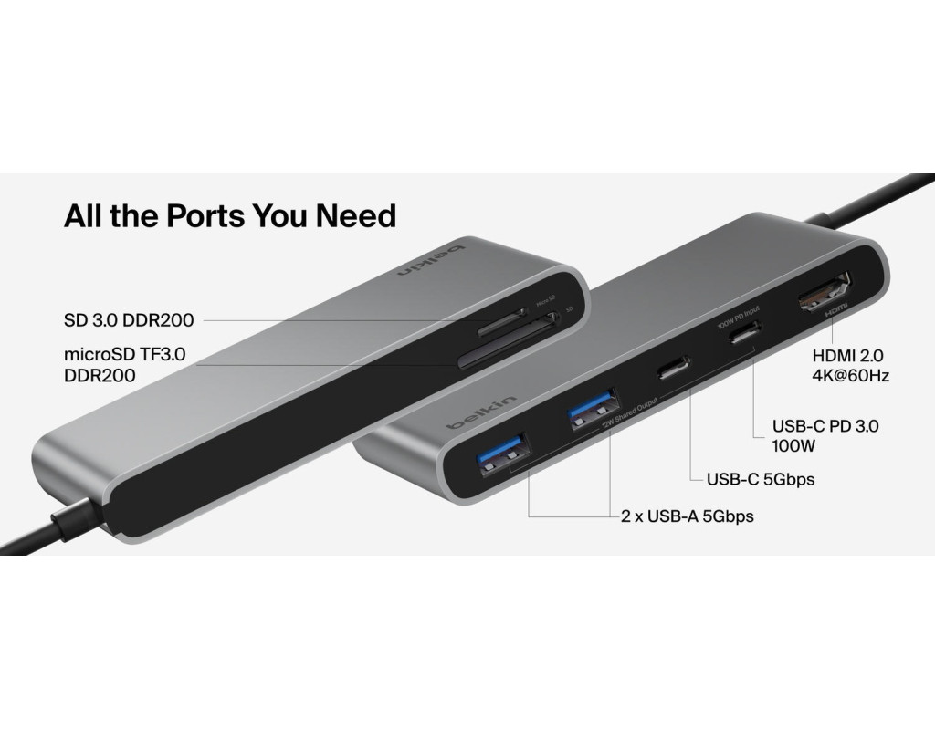 | Belkin USB-C 7-в-1 Multiport Dock розширює можливості ноутбука, додаючи сім портів через одне підключення USB-C. Хаб підтримує виведення зображення до 4K@60 Гц для комфортної роботи з зовнішнім дисплеєм. Порти USB-A, USB-C та кардрідери дозволяють підключати периферійні пристрої й носії даних одночасно. Power Delivery до 100 Вт забезпечує заряджання ноутбука під час роботи. Компактний формат підходить для використання вдома, в офісі та в дорозі. |