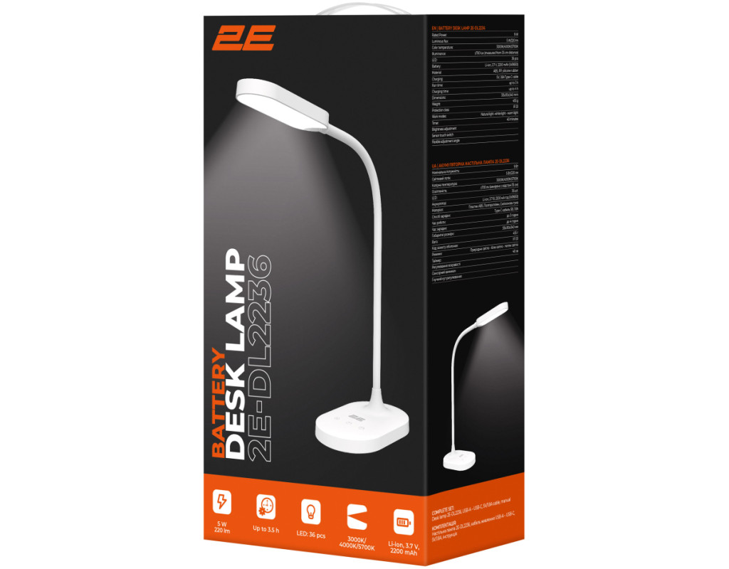 | Настільна лампа 2E-DL2236 – елегантне поєднання стилю і практичності. Потужність 9 Вт забезпечує яскраве та рівномірне освітлення і пропонує три режими колірної температури (теплий 3 000 K, нейтральний 4 000 K, холодний 5 700 K), які оптимально згодяться для роботи, читання чи відпочинку. |