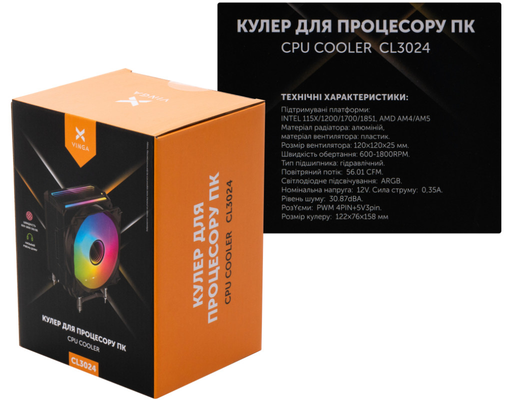 Для процесорів - INTEL, AMD, сокет - AM4, AM5, 1150, 1151, 1152, 1155, 1156, 1200, 1700, 1851, матеріал радіатора - алюміній, діаметр вентиляторів - 120 мм, Максимальна частота обертів - 1800 об/хв, Тип підшипників - гідравлічний, рівень шуму - 30.5 dB, роз'єми живлення - 4-pin PWM, 3-pin, Підсвічування - ARGB