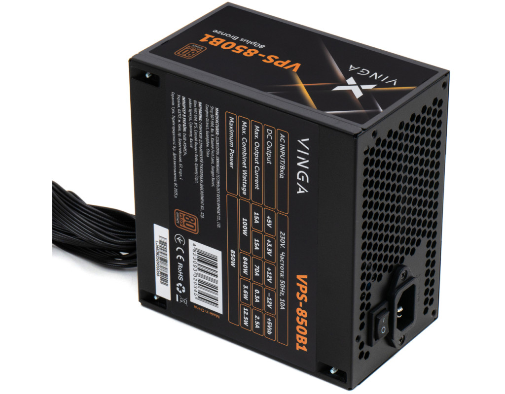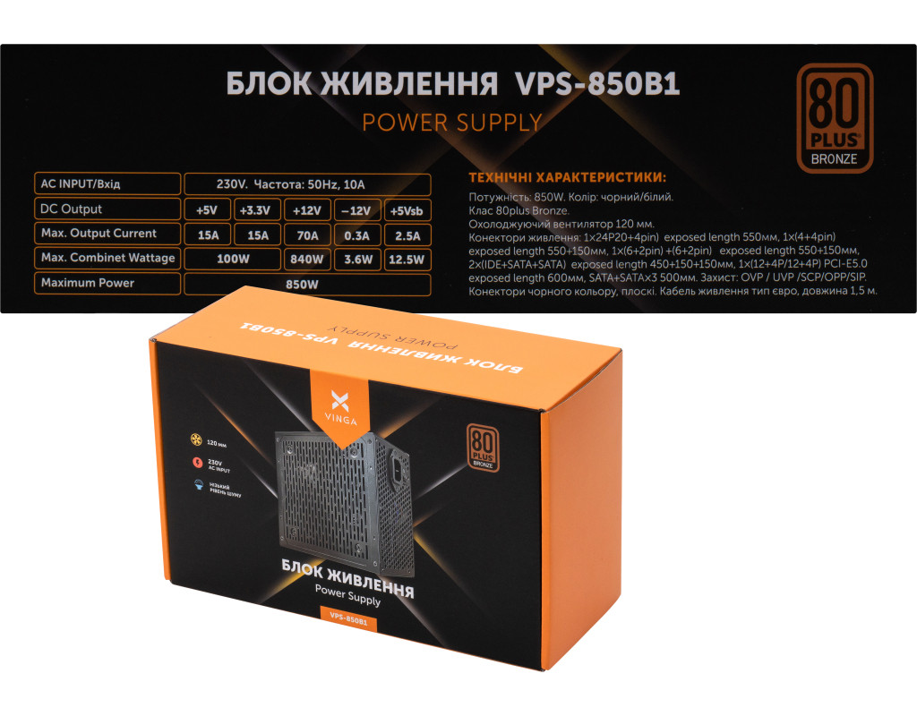 | Блок живлення Vinga 850W (VPS-850B1) є високоякісним рішенням для живлення Вашого комп'ютера, яке відзначається надійністю, ефективністю та сучасними технологіями. З потужністю в 850 Вт, цей блок забезпечує оптимальне та стабільне живлення для більшості сучасних комп'ютерних конфігурацій, включаючи ті, що потребують значних ресурсів графічного процесора. Основний стандарт цього блоку живлення – ATX, що робить його сумісним із переважною більшістю сучасних материнських плат. Якість та надійність підтверджуються наявністю сертифікації 80 PLUS Bronze, яка гарантує ефективність на рівні не менше 85%. Це дозволяє зменшити енергоспоживання та знижує витрати на електроенергію, забезпечуючи при цьому відповідний рівень охолодження завдяки ефективному вентилятору діаметром 120 мм. Важливою особливістю Vinga VPS-850B1 є активний PFC-модуль, що оптимізує процес передачі електроенергії та знижує втрати у мережі. Це сприяє підвищенню загальної стабільності та енергоефективності системи, що є особливо важливим для ентузіастів та геймерів. Крім стандартного підключення материнської плати 20+4 pin та процесора 1x4 4pin, блок живлення обладнаний роз’ємами для підключення декількох відеокарт: два роз'єми 6+2pin для додаткового живлення графічних процесорів надають можливість під’єднання навіть найвибагливіших компонентів. Для зберігання даних та інших периферійних пристроїв передбачено чотири SATA роз'єми та два додаткових роз'єми Peripheral, що дозволяють гнучко конфігурувати вашу систему під конкретні потреби. Особливу увагу слід звернути на багаторівневу систему захисту, яка включає захист від перевантажень (OLP), перегріву (OTP), перевищення струму на кожному каналі (OCP), загальних перевантажень системи (OPP) та підвищення напруги (OVP). Ці технології забезпечують безпечну роботу вашого комп'ютера, мінімізуючи ризики від виникнення можливих проблем з електроживленням. Параметри корпуса блоку живлення складають 140 х 150 х 86 мм, що робить його сумісним з більшістю комп'ютерних корпусів, забезпечуючи легкість у встановленні та надійність у щоденному використанні. Блок живлення Vinga 850W (VPS-850B1) – ідеальний вибір для тих, хто цінує якість, надійність та ефективність у кожній деталі своєї комп'ютерної системи. Завдяки своїм оптимальним характеристикам та передовим технологіям, цей блок живлення стане незамінним елементом вашого ПК, забезпечуючи його стабільну роботу в будь-яких умовах. |