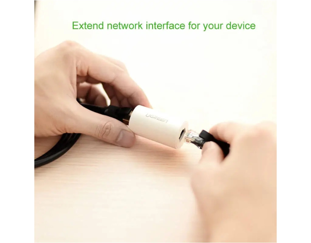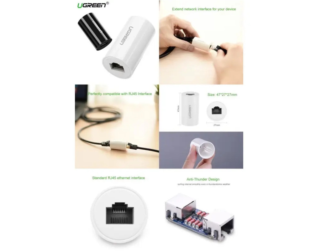З'єднувач крученої пари Ugreen NW116 Це пристрій, що забезпечує рішення для розширення дротового підключення до Інтернету зі швидкістю передавання даних до 10 Гбіт/с. Пристрій має сучасний, компактний дизайн, корпус із високоякісного ПВХ і вбудовану мікросхему блискавкозахисту, що допомагає захистити мережеві пристрої, як-от сучасний маршрутизатор, від пошкоджень через удари блискавки.