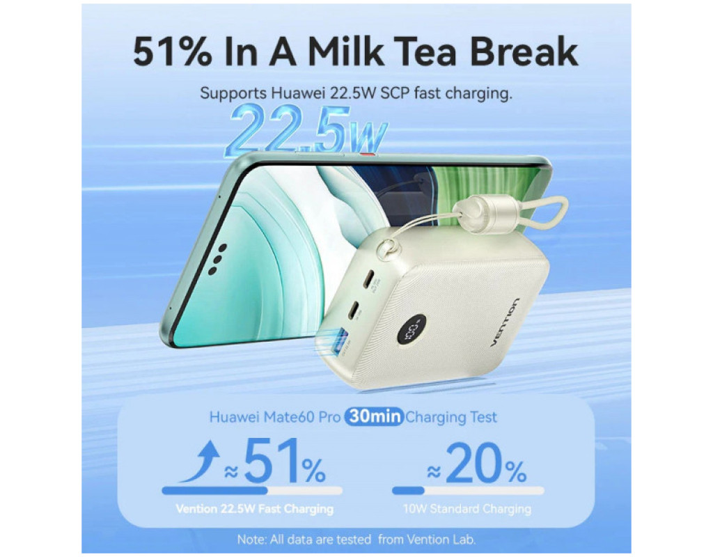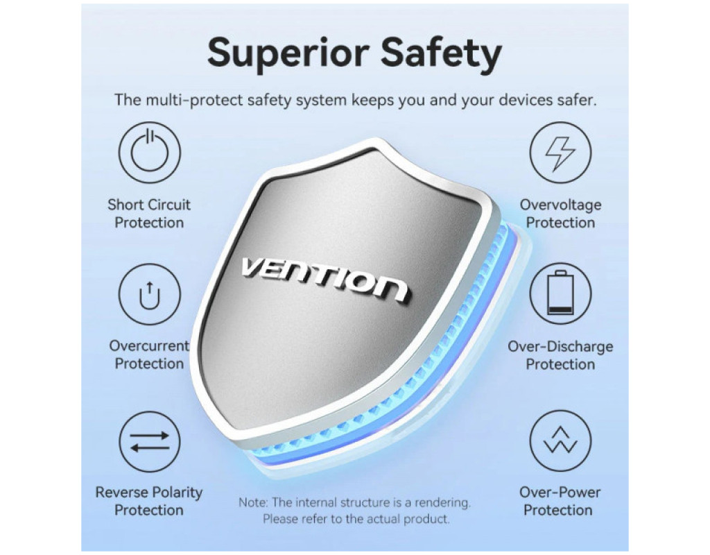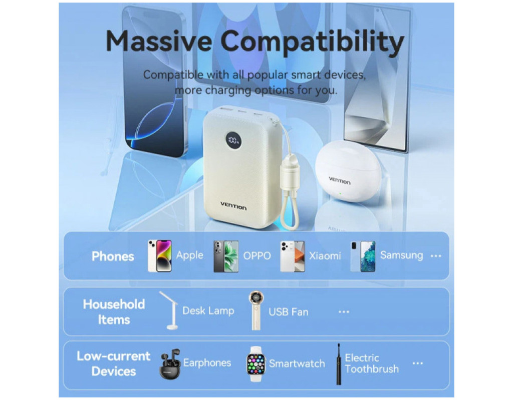 Компактна універсальна мобільна батарея ємністю 20000 мАг Vention 20000mAh 22,5W Fast Charging допоможе швидко та безпечно зарядити USB пристрої. Вона підтримує протокол швидкого заряджання PD 22,5 Вт. УМБ оснащена трьома USB портами та двостороннім кабелем USB Type-С довжиною 17 см. Вона підтримує одночасне заряджання декількох пристроїв. Порт USB Type-С1 працює з максимальною вихідною потужністю 20 Вт, порт USB Type-А зарядить підключені пристрої з потужністю до 22,5 Вт. Заряджайте батарею через порти USB Type-С1 та USB Type-С2 з максимальною потужністю 18 Вт. Вбудований LED дисплей сповіщатиме про поточний рівень заряду. Продуманий дизайн УМБ Vention 20000mAh 22,5W Fast Charging забезпечує зручне користування. Спеціальний брелок із місцем для зберігання кабелю легко трансформується в ручку для перенесення, коли кабель не використовується. Беріть УМБ на борт літака, вона відповідає стандартним вимогам авіакомпаній до розміру та безпеки зарядних пристроїв. Вбудований захист від короткого замикання, перенапруги, перевантаження по струму та інших потенційних небезпек робить безпечною експлуатацію УМБ Vention 20000mAh 22,5W Fast Charging. |