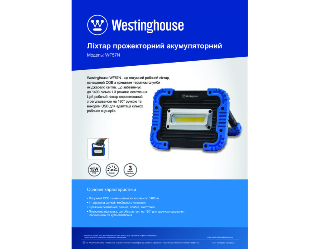 Багатофункціональний прожекторний ліхтар WF57N живиться вбудованим літій-іонним акумуляторним блоком (18650*2) і забезпечує чудове освітлення за допомогою потужного COB діода. Це більш потужна версія ліхтаря WF57 - світловий потік збільшено до 1400 лм. Ліхтар можна використовувати в трьох режимах освітлення: високий та низький світловий потік, або режим мерехтливого світла для передачі сигналу тривоги іншим. Перемикання між режимами освітлення відбувається натисканням на вимикач. За допомогою кронштейна, що обертається на 180°, можна забезпечити різні кути падіння світла. Ліхтар можна заряджати від кабелю USB, що входить до комплекту. Наявна світлодіодна індикація рівня заряду , що дозволить контролювати рівень заряду та бути завжди готовим до використання. Ліхтар оснащений захистом від перерозрядження та перезарядження акумулятора, забезпечуючи його використання в безпечному режимі для подовження терміну використання виробу. Окрім функціонування у якості звичайного прожекторного ліхтаря, цей прилад також може використовуватися як портативний зарядний пристрій, забезпечуючи додаткове джерело енергії під час невідкладних ситуацій – це ідеальний вибір для ремонтних робіт, кемпінгу, рибальства, мисливства й інших видів активного відпочинку. ПОНАД 135 РОКІВ ІННОВАЦІЙ У СФЕРІ ЕЛЕКТРОТЕХНІКИ – електротехнічні інновації додані у кожен портативний освітлювальний прилад.