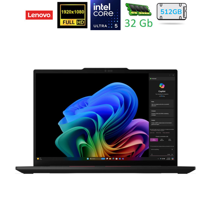 14", 1920x1200 (WUXGA), IPS, 500nits, Intel Core Ultra 5 235U (1.6 - 4.9 ГГц), 32 ГБ, SSD - 512 ГБ, Intel Graphics, DOS, 65 Втг, підсвічування клавіатури, сканер відбитків пальців, українська клавіатура, 1.24 кг, чорний