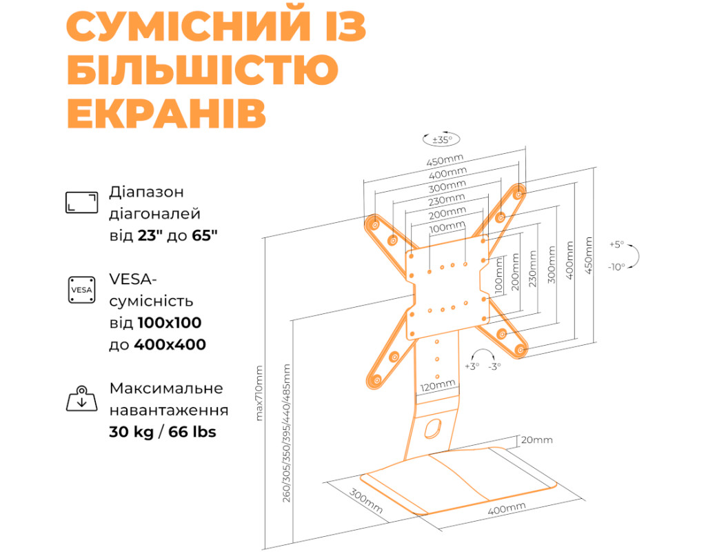 | Настільне кріплення для телевізора KIVI Motion Stand KIVI Motion Stand — це сучасна настільна підставка для телевізора, що поєднує стильний металевий дизайн із розширеною функціональністю. Вона стане практичним рішенням для дому або офісу, дозволяючи розмістити телевізор без свердління стін і легко налаштувати його положення для максимально комфортного перегляду. Завдяки можливостям повороту, нахилу та регулювання висоти, підставка забезпечує оптимальний кут огляду з будь-якого місця в кімнаті. Міцна металева основа гарантує стабільність і надійність, а вбудований отвір для кабелів допомагає підтримувати охайний вигляд робочого простору. Основні переваги