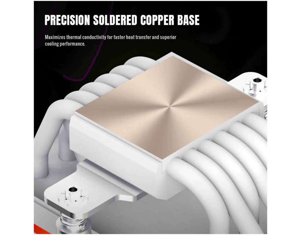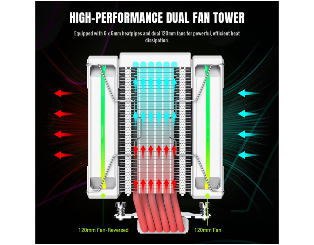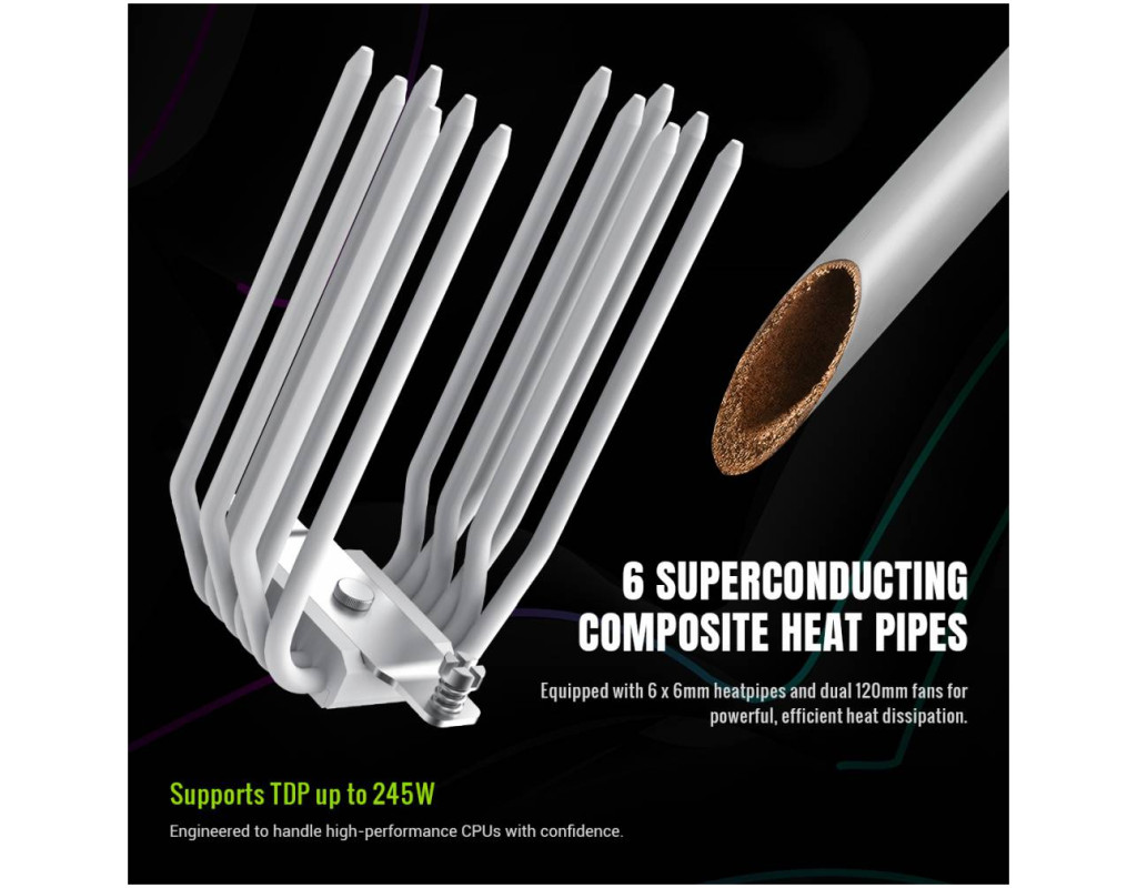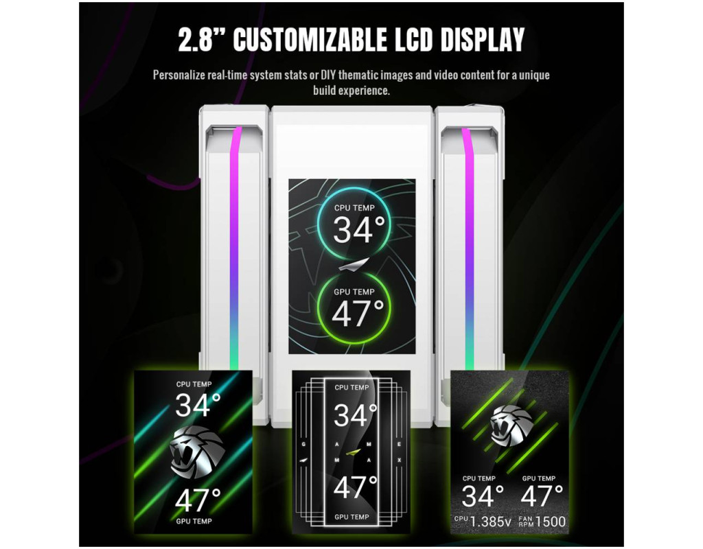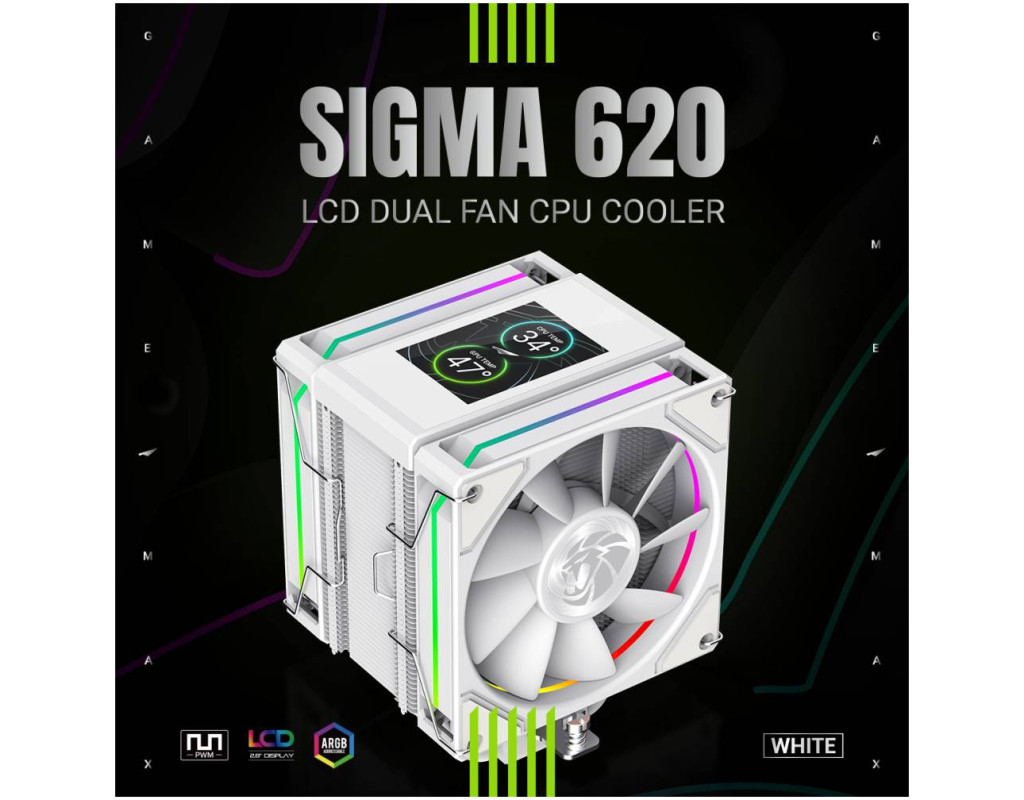| SIGMA 620 WH — високопродуктивний процесорний кулер з LCD та ARGB SIGMA 620 WH — це потужний баштовий кулер для процесора, створений для ефективного охолодження сучасних високопродуктивних CPU. Завдяки двом 120-мм вентиляторам, шести тепловим трубкам і підтримці TDP до 245 Вт він забезпечує стабільну роботу системи навіть під максимальним навантаженням, поєднуючи продуктивність із яскравим дизайном. 2,8" кастомізований LCD-дисплей Відображайте температуру, навантаження системи або власні зображення й відео, створюючи унікальний вигляд вашого ПК. Подвійна баштова конструкція з високою ефективністю 6 теплових трубок діаметром 6 мм та два 120-мм вентилятори забезпечують швидке й рівномірне відведення тепла. Мідна основа з прецизійним паянням Гарантує максимальну теплопровідність і швидку передачу тепла від процесора. Ефектне ARGB-підсвічування Кільцева ARGB-ілюмінація вентиляторів із повною синхронізацією з материнською платою для персоналізації підсвітки. PWM-вентилятори з високим повітряним потоком Поєднання високого тиску та потоку повітря для оптимального балансу між охолодженням і рівнем шуму. Підтримка TDP до 245 Вт Впевнене охолодження потужних процесорів для геймінгу, стримінгу та професійних задач. SIGMA 620 WH — ідеальний вибір для користувачів, які хочуть отримати максимум продуктивності, стильний вигляд і повний контроль над системою охолодження. |