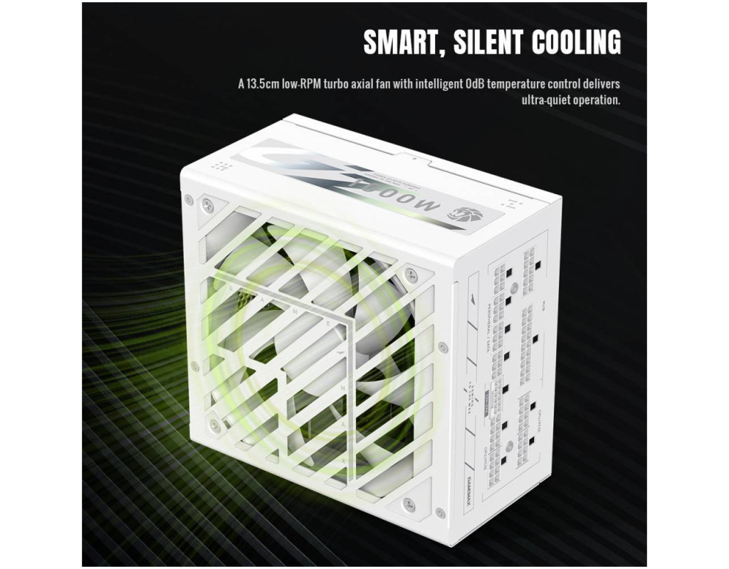 | Блок живлення GAMEMAX GZ 1000W GOLD ATX3.1 / PCIe 5.1 GAMEMAX GZ 1000G WH — це потужний та надійний блок живлення для сучасних ігрових і робочих ПК, розрахований на високі навантаження та новітні комплектуючі. Підтримка стандартів ATX3.1 і PCIe 5.1 з нативним роз’ємом 12V-2x6 забезпечує стабільне та безпечне підключення відеокарт RTX™ 40/50 серій, мінімізуючи втрати струму та підвищуючи загальну ефективність системи. Асиметричний дизайн вирізняє блок живлення серед класичних моделей і додає системі стильного, сучасного вигляду. Вбудований 13,5 см турбо-вентилятор з низькими обертами та інтелектуальним режимом 0dB автоматично зупиняється за низьких температур, забезпечуючи майже безшумну роботу. Використання японських конденсаторів з ресурсом до 105°C гарантує тривалий термін служби та стабільну подачу живлення. Сертифікація 80 PLUS Gold підтверджує високу енергоефективність, менше тепловиділення та зниження енергоспоживання. Матриця твердотільних конденсаторів зменшує пульсації та електричні шуми, забезпечуючи чисте й стабільне живлення всіх компонентів. Подвійна система EMI-фільтрації та захист від перевантажень і стрибків напруги надійно оберігають систему від пошкоджень. Ключові переваги: