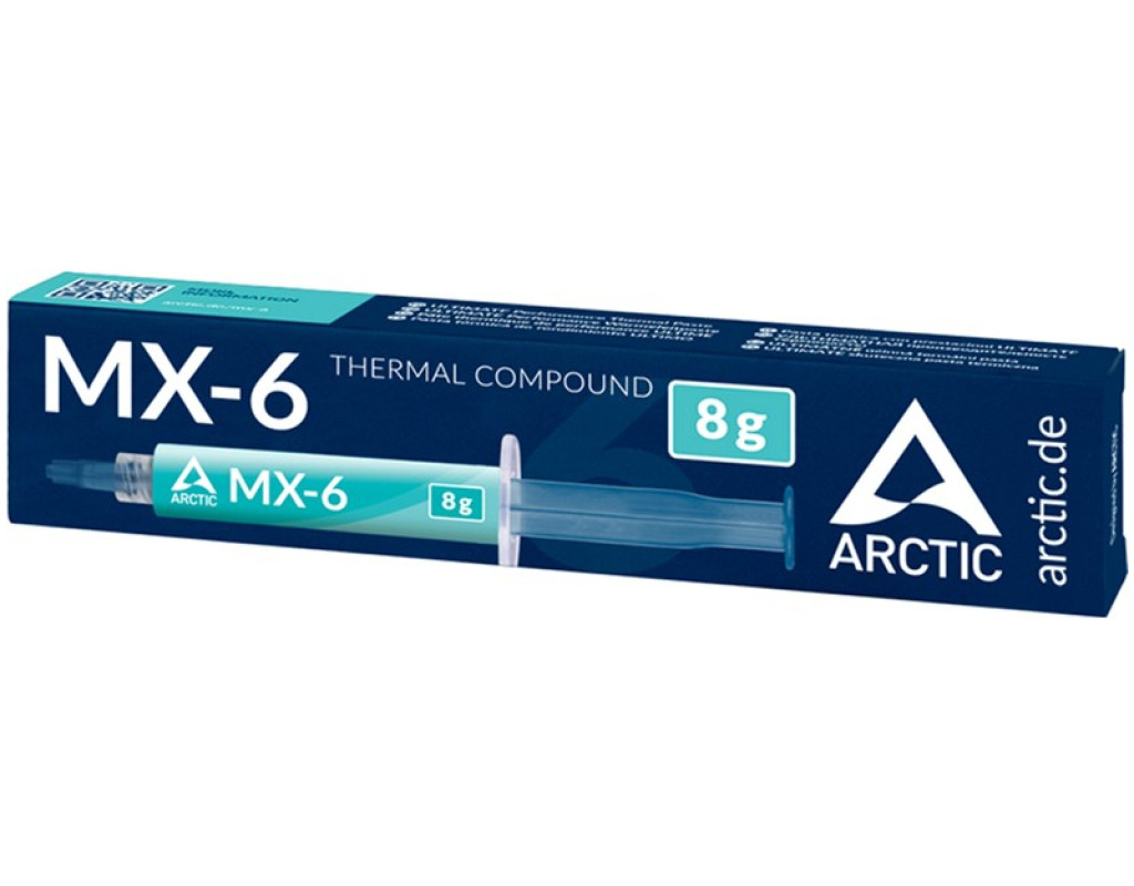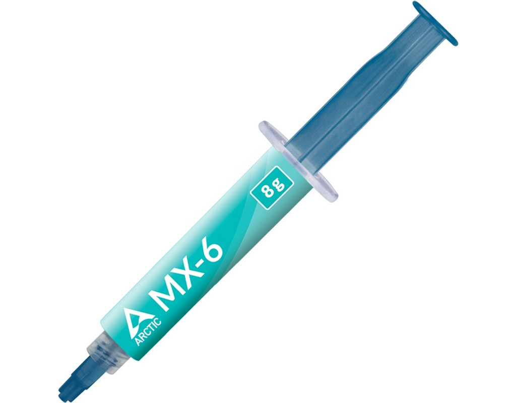 Термопаста Arctic Cooling MX-6, Об'єм шприца - 8г, теплопровідністю 7.5 Вт/(м*К) та щільністю 2.5 г/куб.см. Термопаста не проводить струму, тому спричинити короткі замикання вона не зможе. ACTCP00080A
