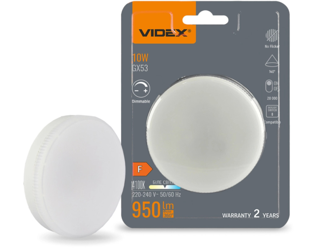 | LED лампа VIDEX GX53 10W 4100K 220V димерна - це сучасне інноваційне рішення для освітлення вашого простору. Використовується в сучасних світильниках як для загального освітлення так і декоративного, інтер'єрного та акцентного. Це все залежить від дизайнерських та особистих смакових якостей споживача. З її потужністю 10W і яскравістю 1000 Lm, вона забезпечує якісне та яскраве світло, при цьому споживаючи мінімум енергії. Додатковою перевагою є її сумісність зі світлорегуляторами. Особливості: