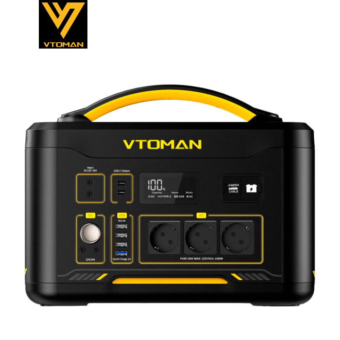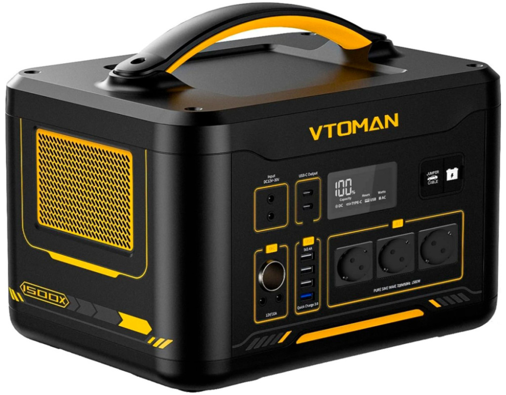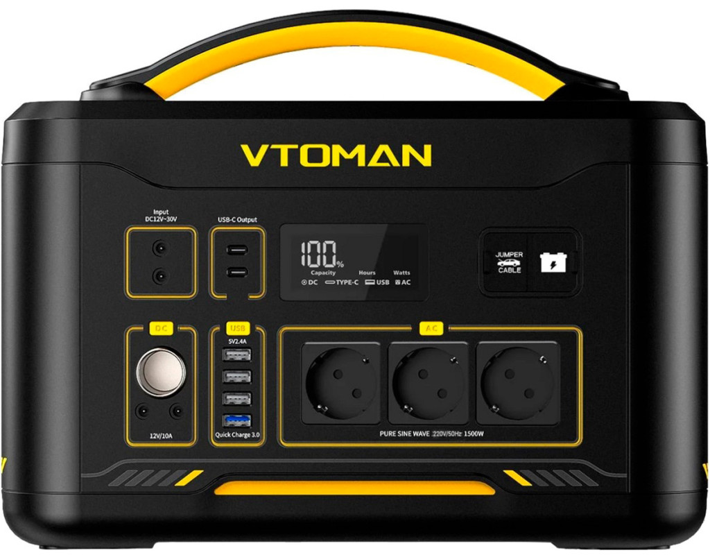 Зарядна станція Vtoman Jump 1500X загальною потужністю 1500 Вт – це надійне резервне джерело енергії із чистою синусоїдою, яким ви можете користуватись як вдома, так і в тривалій подорожі чи кемпінгу. Надійні LFP акумулятори преміум-класу акумулятори стійкі до високих температур, вони витримують до 3100 зарядних циклів, а це - близько 55000 робочих годин. Станція Vtoman Jump 1500X підтримує одночасне зарядження до 12 різних пристроїв. Вона оснащена трьома розетками змінного струму, чотирма портами USB-А, двома USB-C, двома роз’ємами постійного струму та однією автомобільною розеткою, яка забезпечує роботу приладів із малою та високою потужністю. Ексклюзивна технологія V-Starting дозволяє використовувати зарядну станцію в якості пускового пристрою для автомобіля. Для цього знадобиться пара затискачів, яку можна придбати додатково. Технологія V-Beyond робить станцію сумісною з такими приладами та пристроями, як електрична плита, мікрохвильова піч, кондиціонер і холодильник. Vtoman Jump 1500X витримує загальну миттєву вихідну потужність до 3000 Вт. Поповнити заряд електростанції Vtoman Jump 1500X можна різними способами: за допомогою сонячної панелі потужністю до 200 Вт, через адаптер змінного струму 180Вт від електромережі або від автомобільного прикурювача. Додатковий акумулятор ємністю 1548 Вт·год, дозволяє розширити ємність станції до 2376 Вт·год. |