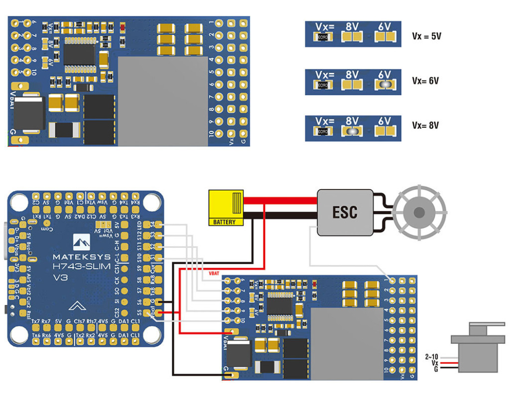 | Стабілізатор напруги Matek Servo PDB, w/12A BEC 9-55V to 5/6/8V Технічні характеристики: - Робочий вхідний діапазон напруги: від 9 до 55 В