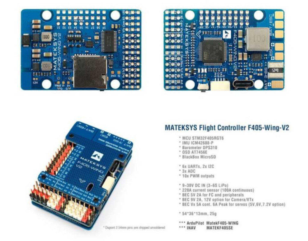 MCU: 168 МГц STM32F405RGT6 1 МБ флеш-пам'яті IMU: MPU6000 (SPI1) Барометр: DPS310 Екранне меню: AT7456E Blackbox: роз'єм MicroSD VCP і 6x UART, 2x виходи під двигуни, 7x виходи сервоприводів 2x I2C 3x світлодіоди для FC STATUS (синій, червоний) та індикатор 3,3 В (червоний) Вбудований інвертор для входу SBUS (UART2-RX) PPM/UART Спільний: UART2-RX SoftSerial на планшеті TX2 Датчик напруги акумулятора: 1:10 (масштаб 1100) Світлодіодна стрічка WS2812: так Біпер: Так RSSI: Так MCU: STM32F405RGT6, 168 МГц, 1 МБ Flash IMU: ICM42688-P Барометр:: DPS310 Екранне меню: AT7456E Blackbox: слот для карти MicroSD 6x UARTs, 1x Softserial_Tx option (INAV) 10 виходів ШІМ 2x I2C 3x АЦП (VBAT, Current, RSSI) Вбудований інвертор для входу SBUS USB Type-C (USB2.0) Прошивка INAV: MATEKF405SE (INAV 6.0 or newer) Прошивка ArduPilot MatekF405-Wing (ArduPlane 4.4 or newer)