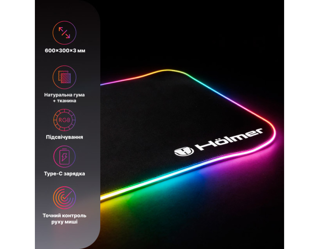 Hölmer GMP-01RGB — це не просто килимок, це центр вашого ігрового сетапу, який поєднує простір, точність і захоплюючу динамічну RGB-підсвітку. Цей великий настільний килимок (600 х 300 мм) забезпечує ідеальне покриття для вашої клавіатури та миші, створюючи ідеальну атмосферу для будь-якої гри. Створіть унікальний ігровий простір! Килимок має яскраве RGB-підсвічування по периметру з 12 режимами роботи: 7 однотонних кольорів, 4 режими «дихаючого» світла та режим швидкого миготіння. Живлення підсвітки здійснюється через сучасний кабель USB Type-C (1.5 м). Поверхня типу Control виготовлена з високоякісного мультиспандекса з помірним плетінням. Це дає вам ідеальний рівень опору для виконання точних, контрольованих рухів миші — критично важливих для снайперських пострілів та стратегічних ігор. Великий розмір (600 х 300 мм) дозволяє розмістити на килимку і клавіатуру, і мишу, що забезпечує стабільність клавіатури та безмежний простір для руху миші. |