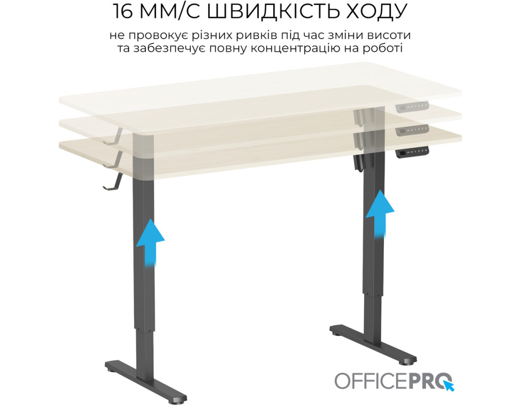Стіл із електрорегулюванням висоти Officepro серії ODE1470 розроблений для бездоганної інтеграції в будь-який домашній інтер'єр або корпоративне середовище, пропонує ідеальне поєднання функціональності, довговічності та доступності. Завдяки потужному двигуну стіл забезпечує плавне, тихе та надійне регулювання висоти одним натисканням кнопки.