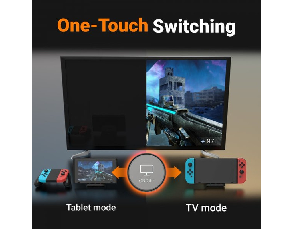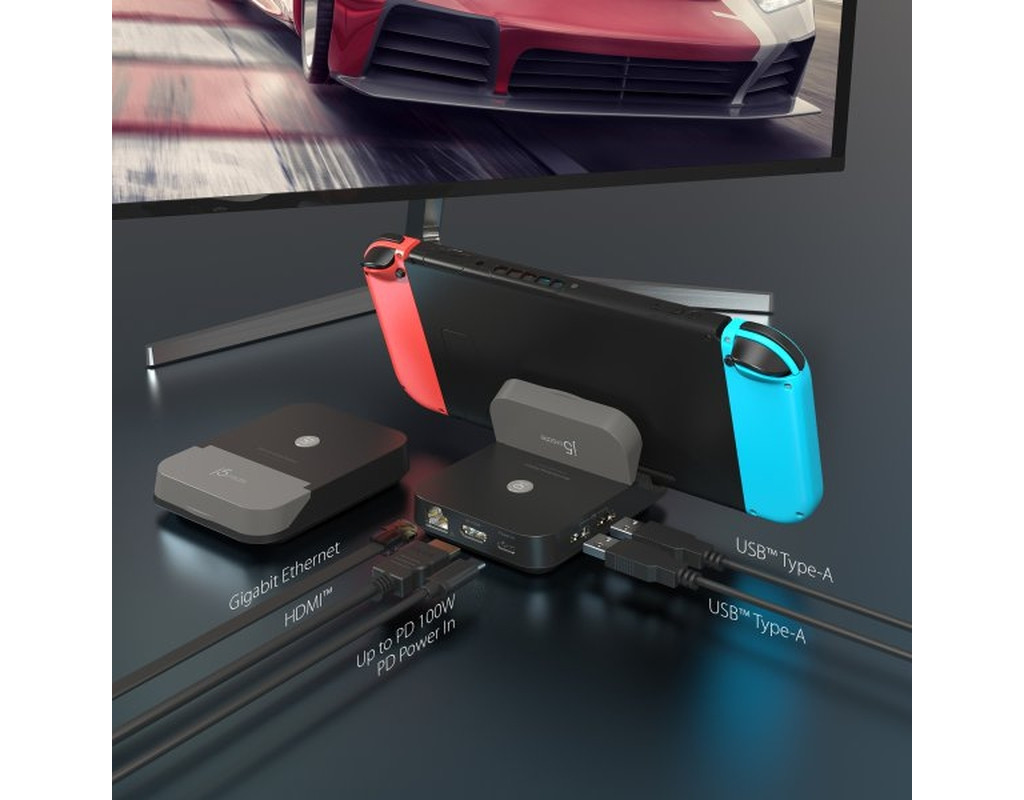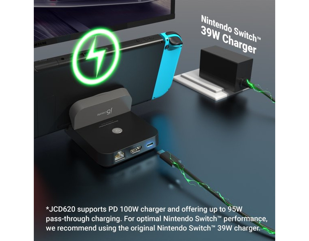 Додайте додаткові функції до вашої Nintendo Switch за допомогою міні-док-станції JCD620. Ця міні-док-станція дозволяє виводити зображення з консолі на HDTV. Підключіть USB Type-A до аксесуарів, таких як ігровий контролер або клавіатура. Док-станція також оснащена високошвидкісним портом Gigabit Ethernet для стабільності мережі. JCD620 дозволяє підключити Nintendo Switch до HDTV з роздільною здатністю до 1080p60Hz. JCD620 також оснащена кнопкою, яка дозволяє перемикатися між дисплеєм Nintendo Switch і дисплеєм телевізора при натисканні. Док-станція забезпечує всі ці функції, будучи набагато меншою за стандартну док-станцію для Nintendo Switch. Вона має порт USB-C Power Delivery, який можна використовувати для заряджання консолі або смартфона, коли підключено адаптер живлення USB-C. Порт HDMI також може виводити зображення з роздільною здатністю 4K, коли підключено пристрій, що підтримує 4K. ОСОБЛИВОСТІ