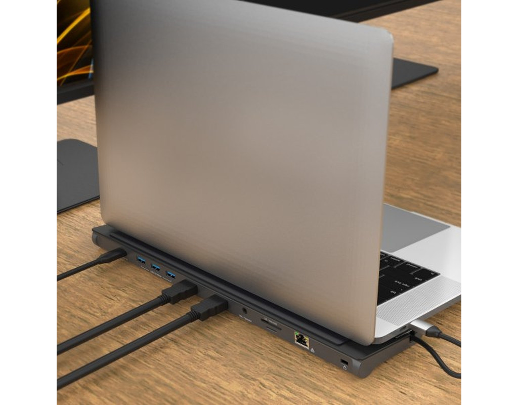 Ця док-станція надає можливість доєднати два монітори HDMI з підтримкою роздільної здатності до 4K (3840 x 2160) на одному дисплеї та до 2K (2048 x 1152) або 1080p на іншому дисплеї. Ви також можете використовувати екран ноутбука як третій дисплей, що полегшує одночасний доступ до декількох програм.