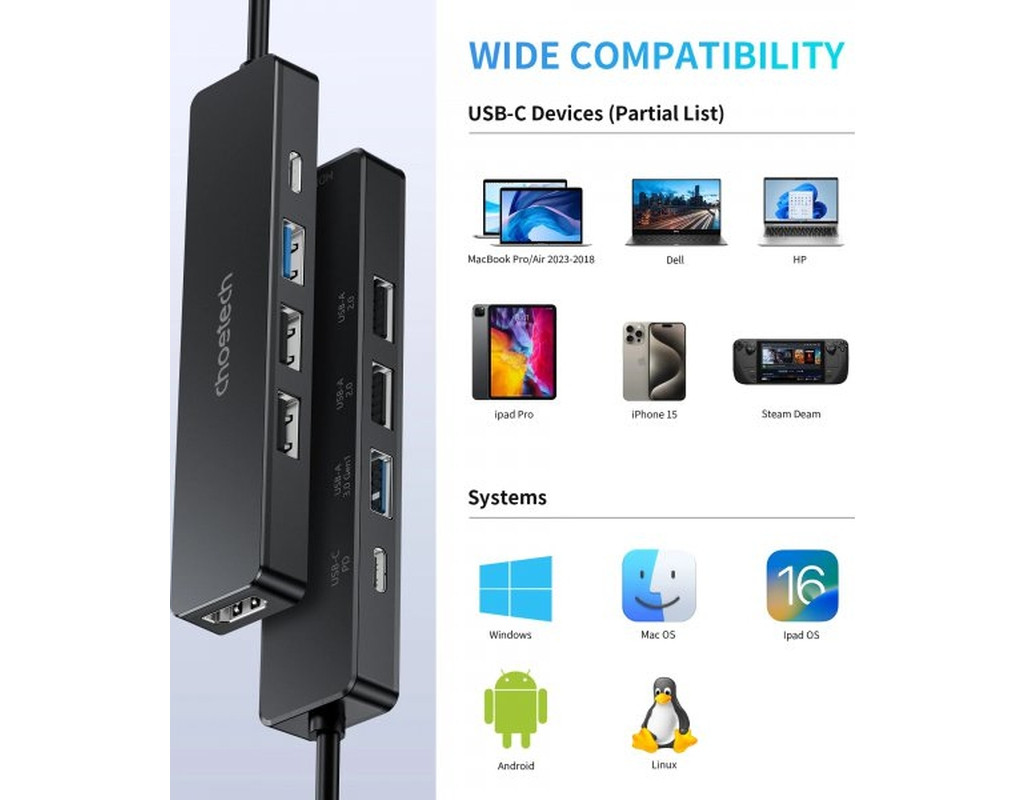 Порт-реплікатор Choetech Dock-Station USB-C 5-in-1 (HDMI/PD/USB-A/USB-C) (HUB-M80-BK)