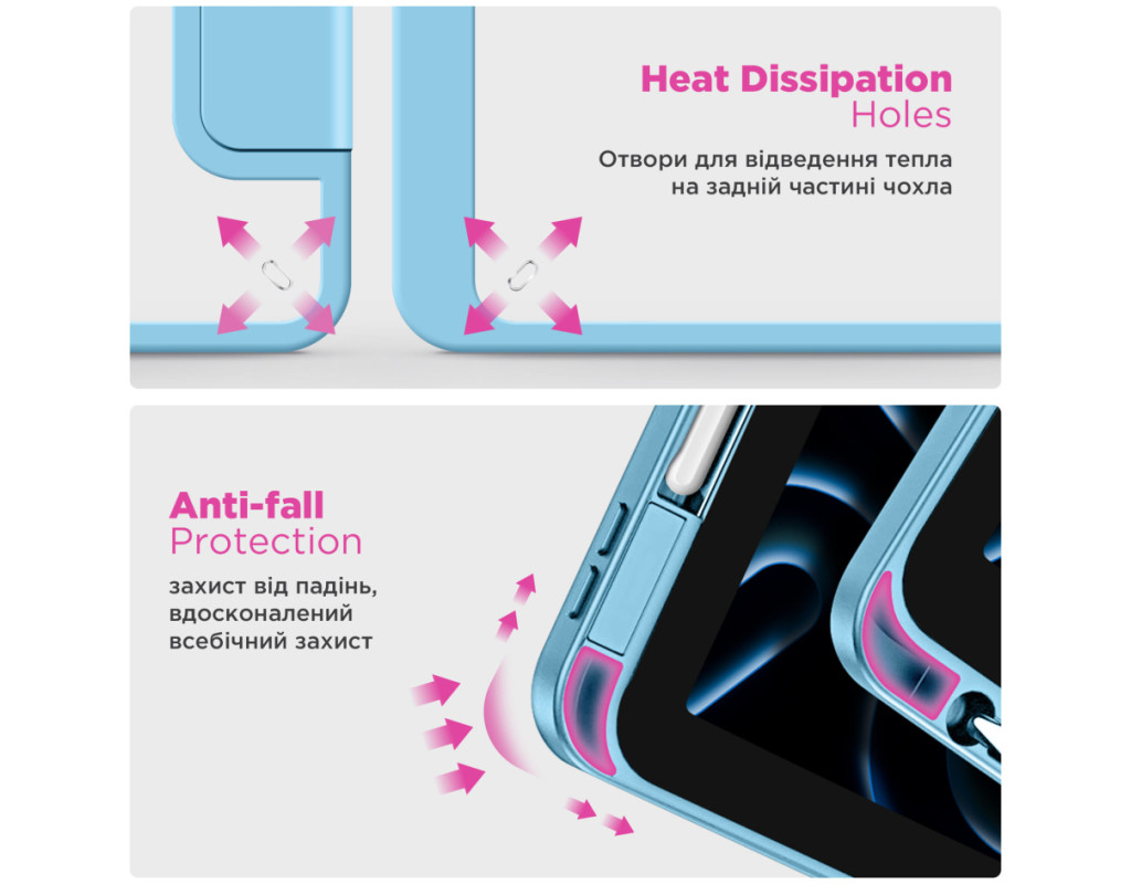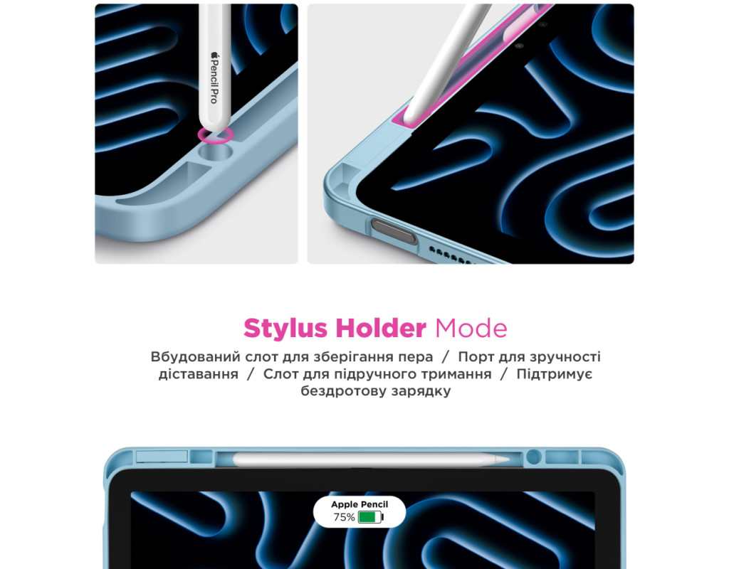 Чохол ArmorStandart Y-Type PEN поєднує захист і функціональність, створений для зручного використання планшета в будь-яких умовах. Вбудований слот для стилуса забезпечує безпечне зберігання стилусу, щоб він завжди був під рукою. Завдяки продуманій конструкції чохол легко трансформується у підставку з двома оптимальними кутами огляду, ідеальними для відеодзвінків у FaceTime або перегляду фільмів. Це забезпечує зручність під час використання планшета як для роботи, так і для відпочинку. Чохол також підтримує функцію Wake/Sleep, яка автоматично пробуджує планшет під час відкриття та переводить його у режим сну після закриття, що зберігає заряд батареї. Матеріали, з яких виготовлений чохол, забезпечують надійний захист планшета. Передня панель виконана з якісної PU шкіри, що приємна на дотик і стійка до зносу. Прозора задня спинка з акрилу не лише захищає пристрій, але й дозволяє демонструвати оригінальний дизайн планшета, а бокові сторони з гнучкого TPU забезпечують додаткову амортизацію при ударах. Особливості: