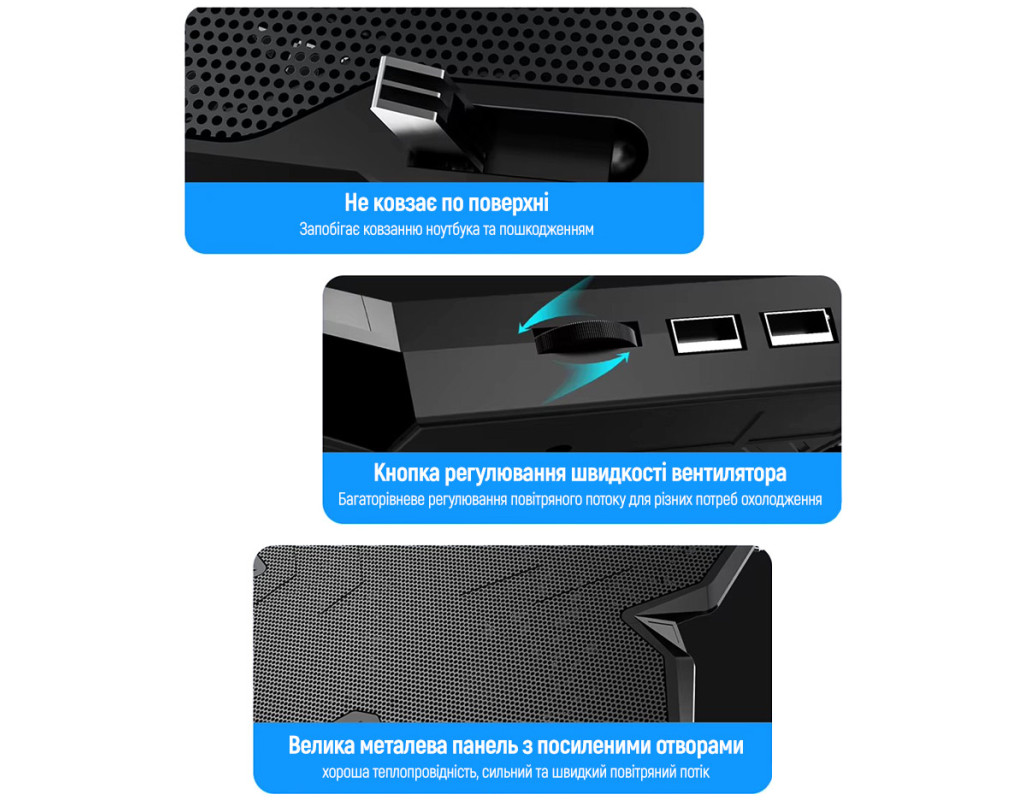| Ігрова охолоджувальна підставка ColorWay — надійний захист і стабільна продуктивність Ігрова охолоджувальна підставка для ноутбука ColorWay створена для користувачів, які цінують ефективне охолодження та комфорт під час тривалої роботи чи інтенсивних ігор. Модель поєднує продуману конструкцію, високу продуктивність і стильний зовнішній вигляд, що робить її чудовим доповненням до будь-якого робочого або ігрового сетапу. Потужне та рівномірне охолодження Підставка оснащена чотирма високоефективними вентиляторами, які створюють рівномірний повітряний потік і забезпечують стабільне зниження температури ноутбука. Така конфігурація запобігає перегріву навіть під значним навантаженням, дозволяючи пристрою працювати на максимальній продуктивності. Міцна конструкція та ергономіка Сітчаста металева поверхня сприяє оптимальній циркуляції повітря та не перешкоджає вільному проходженню потоків. Ергономічний дизайн дозволяє комфортно розташувати ноутбук та працювати або грати протягом довгого часу без дискомфорту. Регульований кут нахилу допомагає налаштувати зручне положення відповідно до індивідуальних потреб. Надійна фіксація пристрою Підставка оснащена захисними фіксаторами, що утримують ноутбук на місці та запобігають його ковзанню під час роботи. Це особливо важливо під час активного набору тексту чи інтенсивних ігрових сесій. Стиль та додаткова функціональність LED-підсвітка надає підставці сучасного вигляду та підкреслює її геймерський характер. Міцний корпус гарантує довговічність та стійкість до щоденного використання, що робить модель універсальним рішенням для геймерів, дизайнерів, програмістів та всіх, хто прагне продовжити термін служби свого ноутбука. Характеристики: