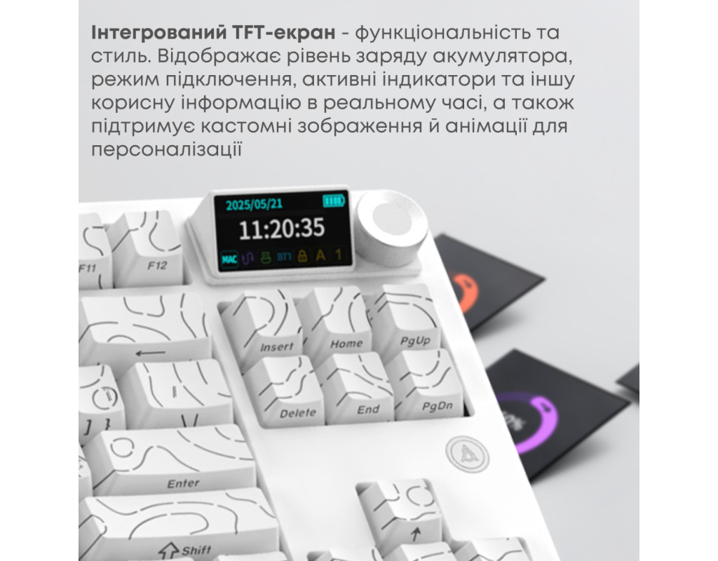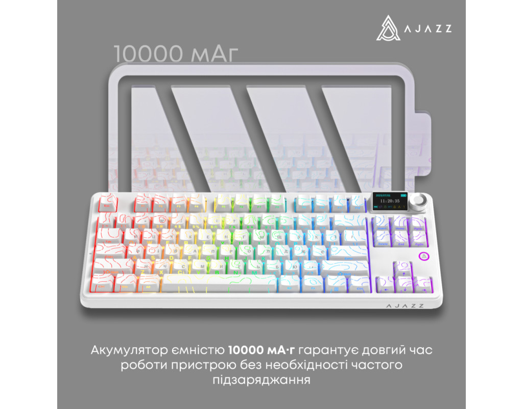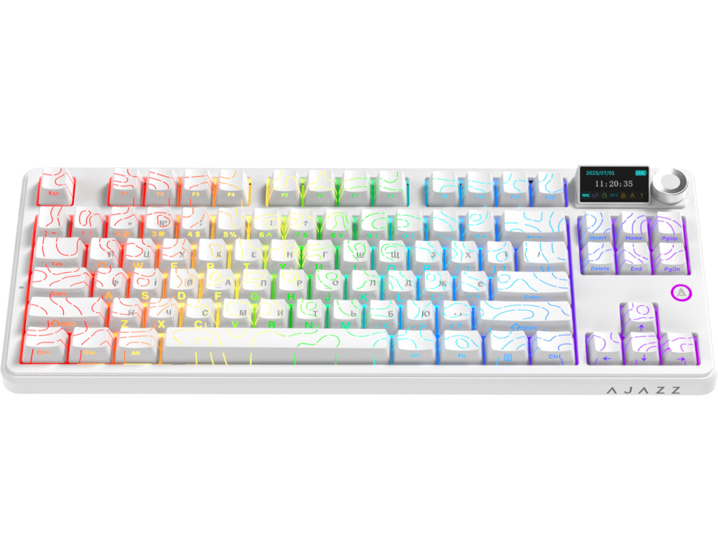 USB, Bluetooth, USB адаптер 2.4 ГГц, Підсвічування - RGB, англійська, українська, Перемикачі (Switches) - Ajazz Maillard Switch, Клавіш - 87, 371.8 x 144.3 x 46.9 мм, 1040 г