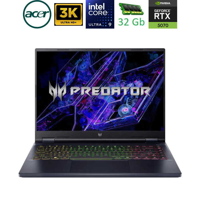 Компактний ігровий ноутбук з підтримкою штучного інтелекту для продуктивної роботи в дорозі. Завдяки процесору Intel Core Ultra, відеокарті NVIDIA GeForce RTX та системі охолодження AeroBlade 3D Fan 5-го покоління, Predator Helios Neo 14 AI створений для того, щоб перемагати у будь-якій ситуації. Для ігор нового покоління Завдяки процесору Intel Core Ultra ви зможете насолоджуватися плавним ігровим процесом, покращеною багатозадачністю та оптимізованою енергоефективністю. Продуктивність із ШІ-прискоренням адаптується в режимі реального часу, забезпечуючи швидку реакцію, коли це має найбільше значення. Це змінює правила гри Відеокарти GeForce RTX серії 50 на базі NVIDIA Blackwell пропонують геймерам та авторам контенту можливості ШІ, що змінюють правила гри. Збільшуйте продуктивність за допомогою NVIDIA DLSS 4, генеруйте зображення з безпрецедентною швидкістю та розкривайте свій творчий потенціал за допомогою NVIDIA Studio. Конкурентна перевага 14.5-дюймовий дисплей Predator Helios Neo 14 AI забезпечує чітке і точне зображення для будь-яких проєктів. Ідеально підходить як для кіберспорту, де швидкість має першорядне значення, так і для креативу, де важлива кожна деталь. Максимальна продуктивність Розроблена для невпинної гри, вдосконалена система охолодження AeroBlade 3D 5-го покоління забезпечує чудове відведення тепла та стабільну максимальну продуктивність без тротлінгу - незалежно від інтенсивності навантаження. Рідка металева термопаста Точно нанесена рідка металева термопаста покращує теплопередачу, знижуючи температуру процесора для плавної та безперебійної роботи в іграх і під час високих навантажень. Векторні теплові трубки Удосконалені векторні теплові трубки ефективно спрямовують тепловий потік від ключових компонентів, підвищуючи стабільність та продуктивність під час інтенсивних ігрових сесій. Вихровий потік Технологічно правильно розміщені вентилятори і термопіна оптимізують повітряний потік, підвищуючи ефективність охолодження та підтримуючи стабільність системи під час тривалих ігрових сесій. Витончений. Надійний. Створений для подорожі Створений для геймерів, які люблять подорожувати, Predator Helios Neo 14 AI має високоякісний корпус, поєднуючи в собі міцність і легку конструкцію. 3-зонна клавіатура RGB та логотип Predator з підсвічуванням завершують образ - адже стиль має таке ж значення, як і продуктивність. Точне підсвічування, персоналізоване керування Налаштуйте свої ігрові параметри за допомогою 3-зонної клавіатури RGB, що забезпечує точну навігацію й захоплююче підсвічування відповідно до вашого стилю гри. Кінематографічний звук Аудіосистема Hi-Fi DTS:X Ultra оточує вас насиченим, просторовим звуком, гарантуючи чітке відтворення кожної ігрової деталі. Фірмовий дизайн, що вирізняється серед інших Логотип Predator з підсвічуванням RGB на корпусі додає виразної високотехнологічної естетики. Необмежена швидкість Відкрийте майбутнє з Wi-Fi 6E і Thunderbolt 4 та насолоджуйтеся надшвидкими іграми з низькою затримкою, безперебійною трансляцією та миттєвим передаванням даних. Підключайте кілька 4K-дисплеїв, завантажуйте файли на високій швидкості та використовуйте периферійні пристрої без перебоїв. Контроль за допомогою PredatorSense та Experience Zone PredatorSense дає змогу контролювати продуктивність системи в режимі реального часу - налаштовуйте режими роботи, керуйте швидкістю обертання вентиляторів і налаш