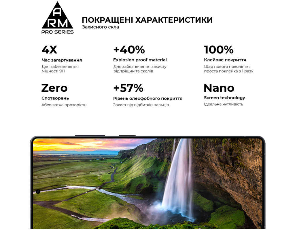 Верхня частина скла містить покращене олеофобне й гідрофобне покриття. Під час використання скла це забезпечує природні тактильні відчуття - пальці легко ковзають по поверхні. Водночас зображення відбивається з автентичною яскравістю й чіткістю без спотворень.