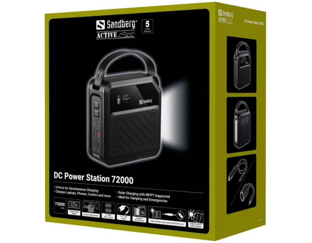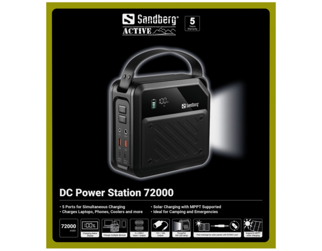 Універсальна мобільна батарея Sandberg 72000mAh 268W - це переносна зарядна станція ємністю 72000 мА год з сумарною вихідною потужністю до 268 Вт. Вона оснащена п'ятьма виходами для поповнення заряду ваших портативних гаджетів, зокрема – ноутбуків, планшетів, смартфонів. Два потужні порти USB Type-C підтримують протокол швидкого зарядження Power Delivery 100 Вт. Порти USB Type-A зарядять підключені пристрої з максимальною потужністю 22,5 Вт, а ноутбуковий вихід DC 100 Вт підійде для заряджання більшості ноутбуків. У комплект постачання входять адаптери для порта DC, які надають гнучкості при підключенні. Поповнюйте заряд УМБ Sandberg 72000mAh 268W через порти USB-C та вхід DC, який підтримує MPPT. Світлодіодний дисплей проінформує вас про поточний рівень заряду. Вбудований ліхтарик потужністю 6 Вт допоможе зорієнтуватись у темряві та легко підключити необхідне обладнання. |