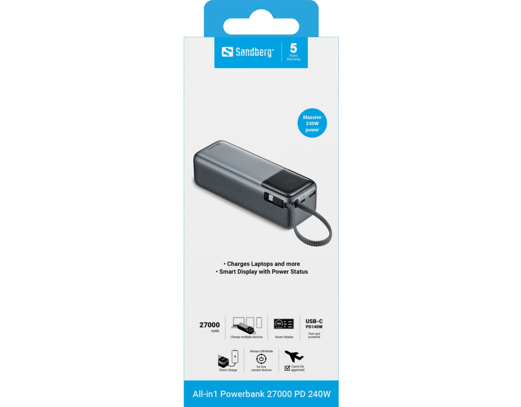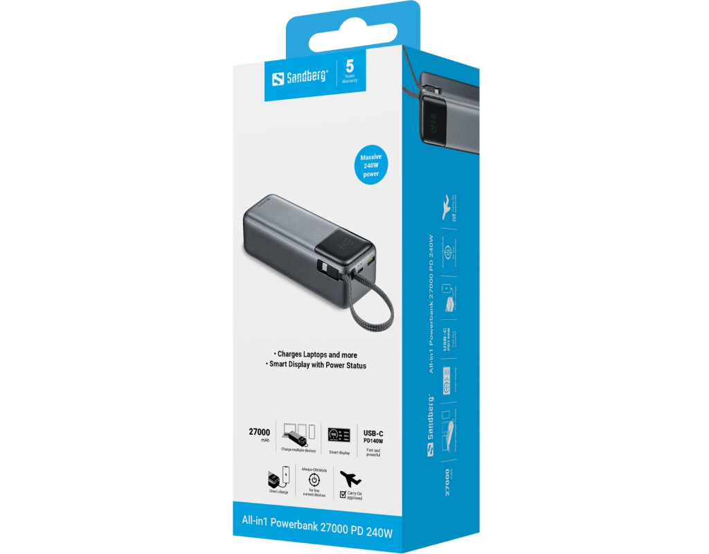 УМБ Sandberg 27000mAh 240W PD, USB-A, USB-C In/Out, with built-in Type-C cable 140W