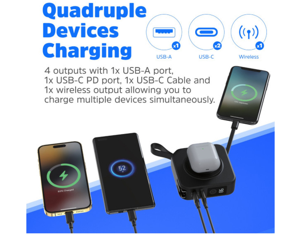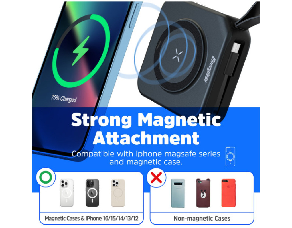 Магнітне бездротове заряджання Павербанк Energizer QM10001AC - це пристрій, який забезпечує повну зручність завдяки функції бездротового заряджання за допомогою магніту. Він сумісний з технологією MagSafe та іншими пристроями, які підтримують магнітну зарядку. Просто покладіть телефон на павербанк, і сильне магнітне з'єднання подбає про стабільність під час заряджання, усуваючи потребу в кабелях. Висока ємність і багатофункціональність Завдяки ємності 10 000 мАг, павербанк Energizer забезпечує енергією для додаткових 36 годин використання смартфона. Він має чотири вихідні порти, включаючи USB-A, USB-C PD, інтегрований кабель USB-C і можливість бездротової зарядки, що дозволяє заряджати кілька пристроїв одночасно. Незалежно від того, чи потрібно вам зарядити телефон, планшет або навушники, цей павербанк впорається з будь-яким завданням. Швидке заряджання та максимальна продуктивність Павербанк Energizer підтримує швидке заряджання, пропонуючи 7.5 Вт для iPhone і до 15 Вт для пристроїв Android у бездротовому режимі. За допомогою USB-C Power Delivery ви можете заряджати свої пристрої ще швидше - з потужністю до 20 Вт ви можете зарядити iPhone з 0% до 50% всього за 30 хвилин. Вбудований кабель USB-C означає, що він завжди буде у вас під рукою, заощаджуючи простір і усуваючи необхідність носити з собою додаткові аксесуари. Безпека та надійність Павербанк Energizer QM10001AC - це не тільки продуктивність, він також повністю захищений. Використовувана система управління PowerSafe Management захищає пристрій від короткого замикання, перевантаження і перегріву. Пристрій має такі сертифікати безпеки, як CE, FCC, ETL, що гарантує його надійність. Завдяки компактним розмірам 86 мм x 86 мм x 31 мм і вазі 252 г, він ідеально підходить для тих, хто шукає безпечний, портативний і багатофункціональний павербанк для повсякденного використання. |